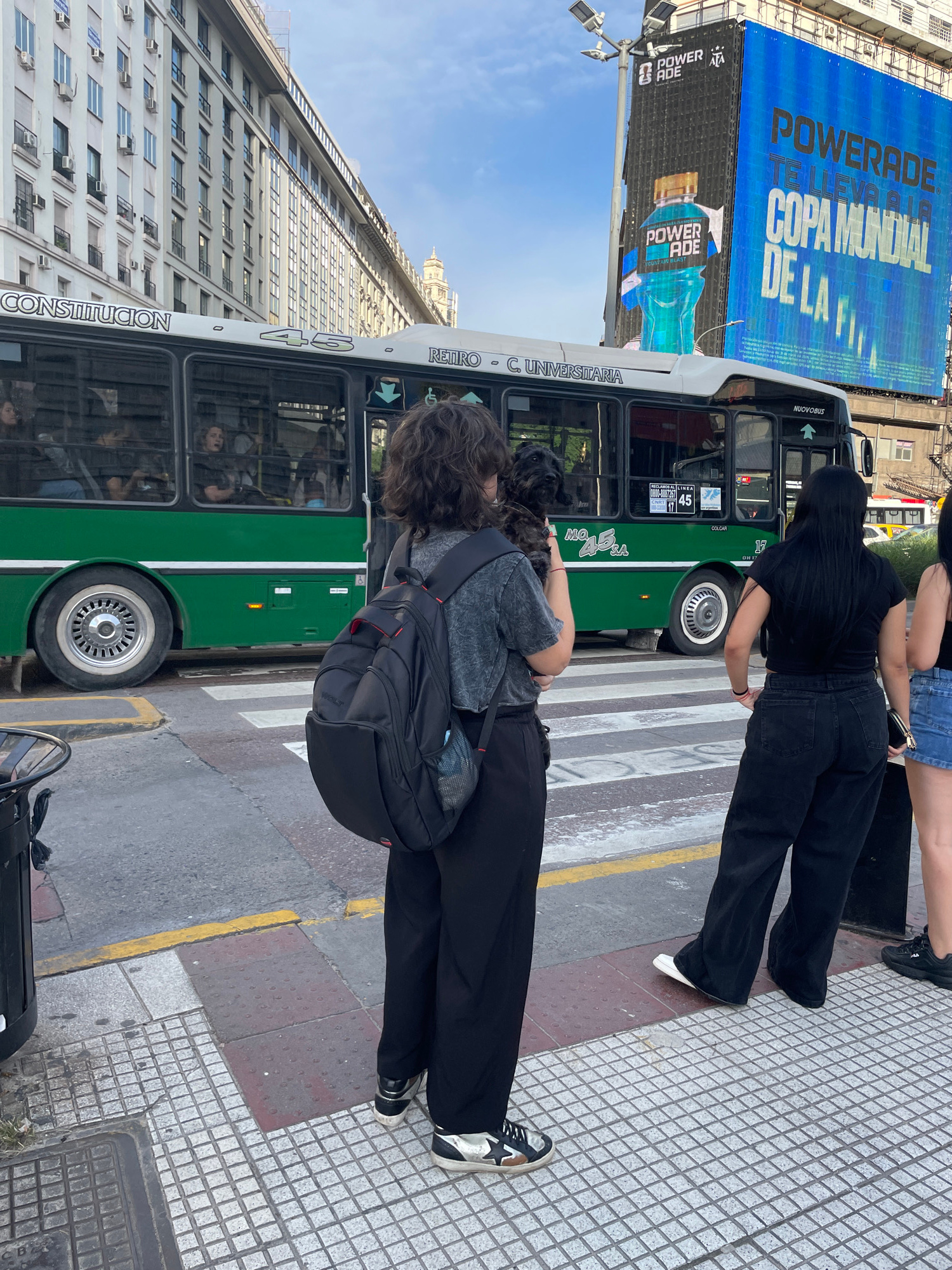 Here is a detailed description of the image: **Setting:** An urban street scene in Buenos Aires, Argentina. The foreground is dominated by the edge of a street and a crosswalk with people. Vertically…read more