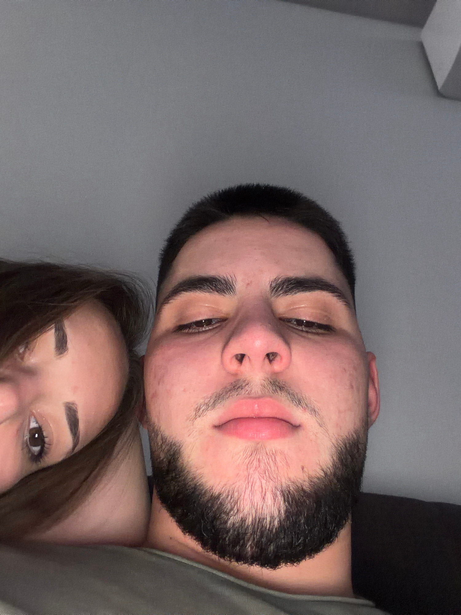 The image shows a selfie of two people. A man with a beard is in the foreground, and a woman with brown hair is slightly behind and below him. They are close together, possibly embracing. The backgrou…read more