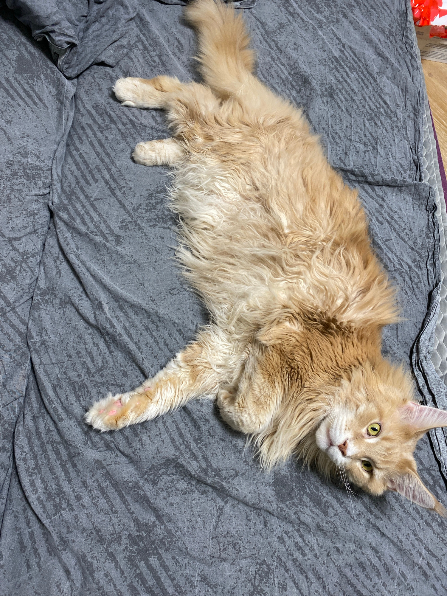 A large, fluffy Maine Coon cat with long, light ginger and cream-colored fur is the central subject, lying relaxed on a textured gray blanket. The cat is stretched out across the frame, facing towards…read more