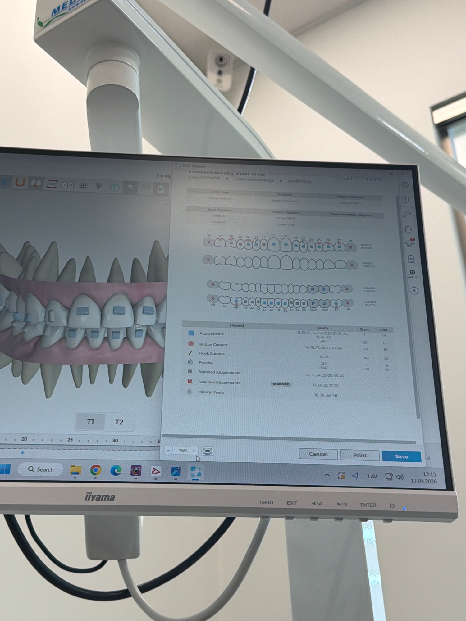 A dental office setting in Riga, Latvia is depicted, focusing on a monitor displaying specialized orthodontic planning software. The primary subject is an iiyama monitor mounted on a white, articulate…read more