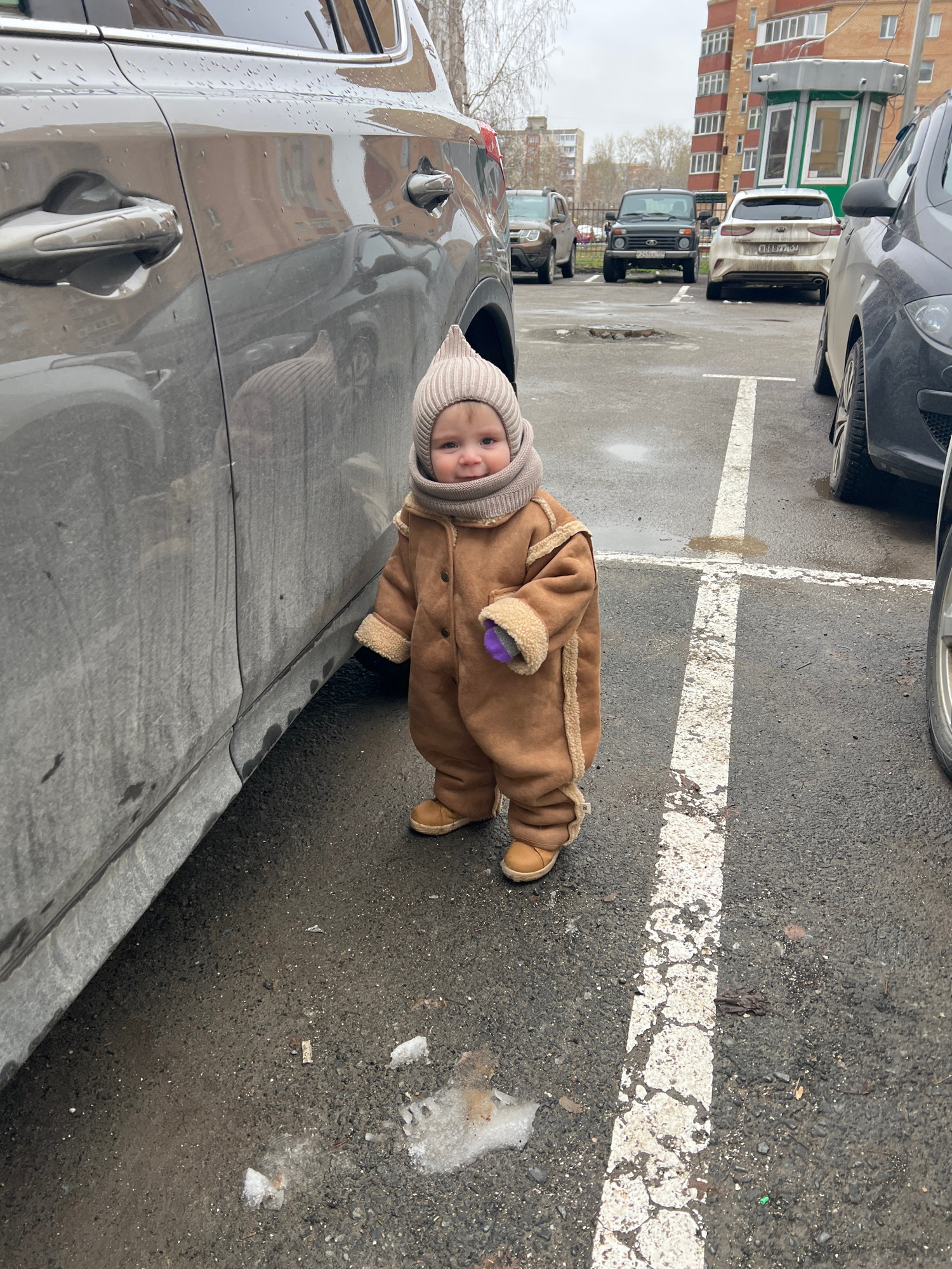 A baby, dressed in a warm, brown, sheepskin-lined jumpsuit and a light beige knit hat, stands on the right side of a wet, dark grey car that occupies the lower left and central portion of the frame. T…read more
