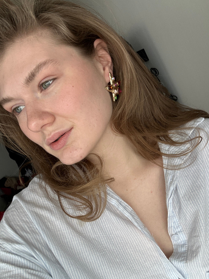 A medium close-up photograph captures a young adult female indoors, posing for the camera. She has fair skin, light brown hair parted on the left side, and light-colored eyebrows. Her eyes, with visib…read more