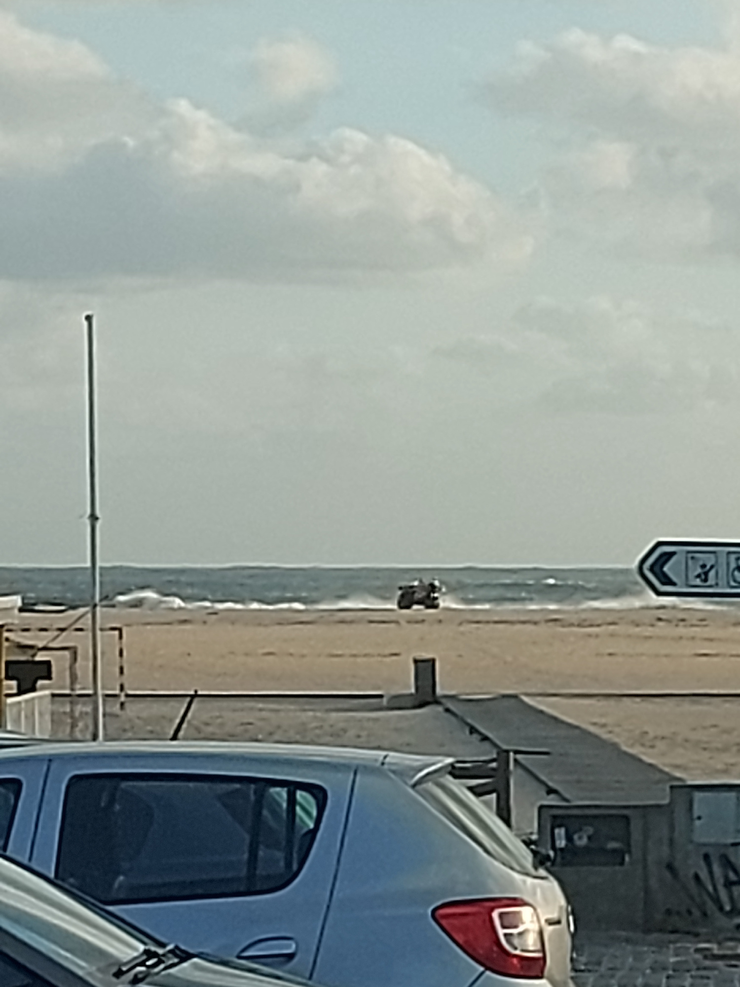 A sideways view captures a section of Figueira da Foz, Portugal's shoreline. To the right, the rear of a silver hatchback car is visible, parked along a paved area next to a brick wall. Further to the…read more