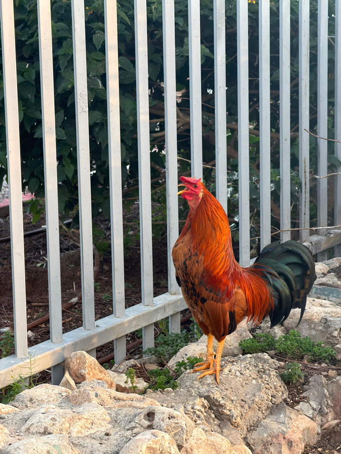 A reddish-orange rooster, featuring iridescent dark green and black tail feathers, stands on uneven rocky ground in Tel-Aviv, Israel. Its beak is open, and its head is tilted slightly upward, indicati…read more