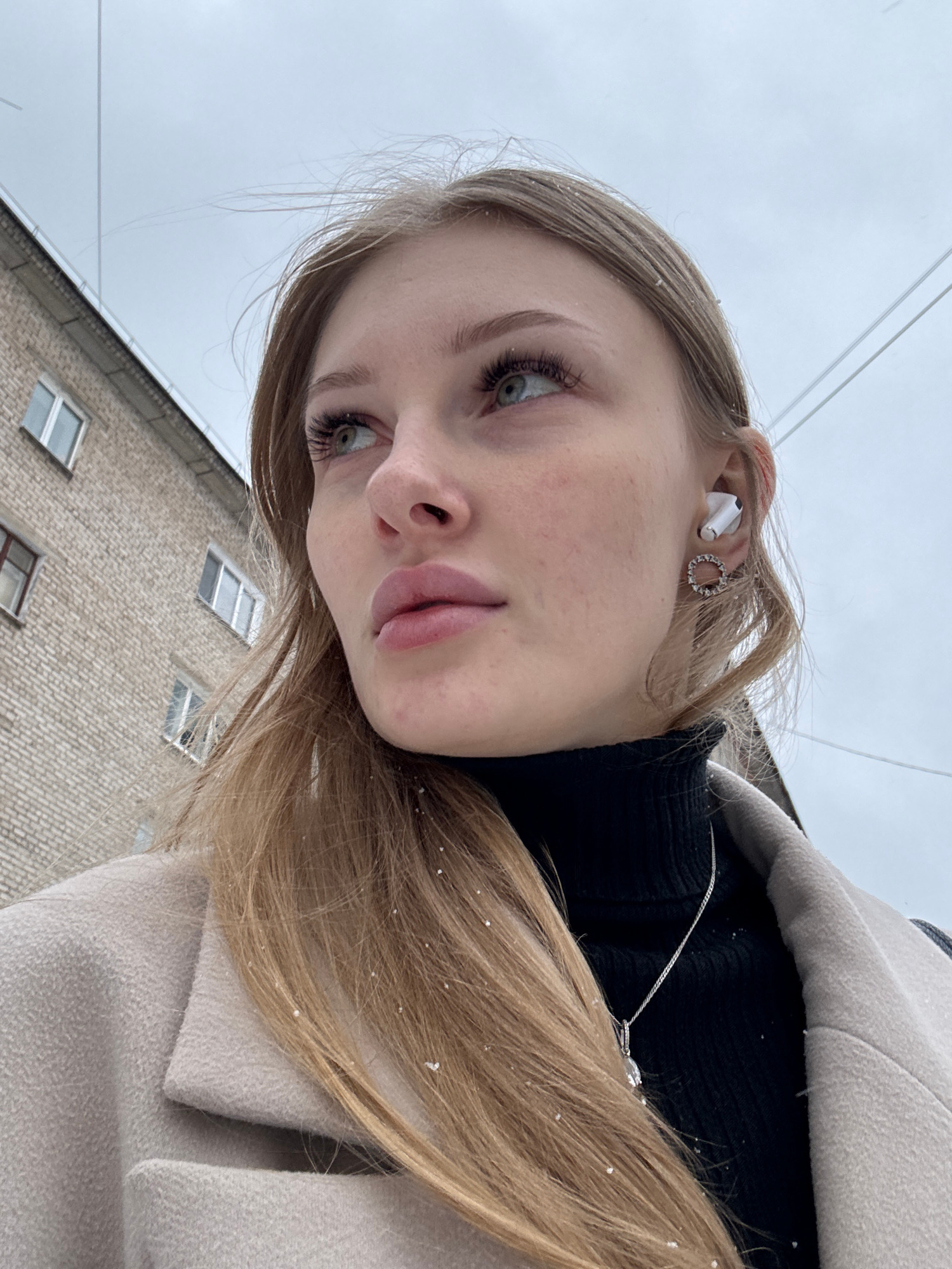 A young woman with blonde hair is looking into the camera at an upward angle. She has an earbud in her left ear and is wearing a black turtleneck, a light beige coat, and a silver necklace. Snowflakes…read more