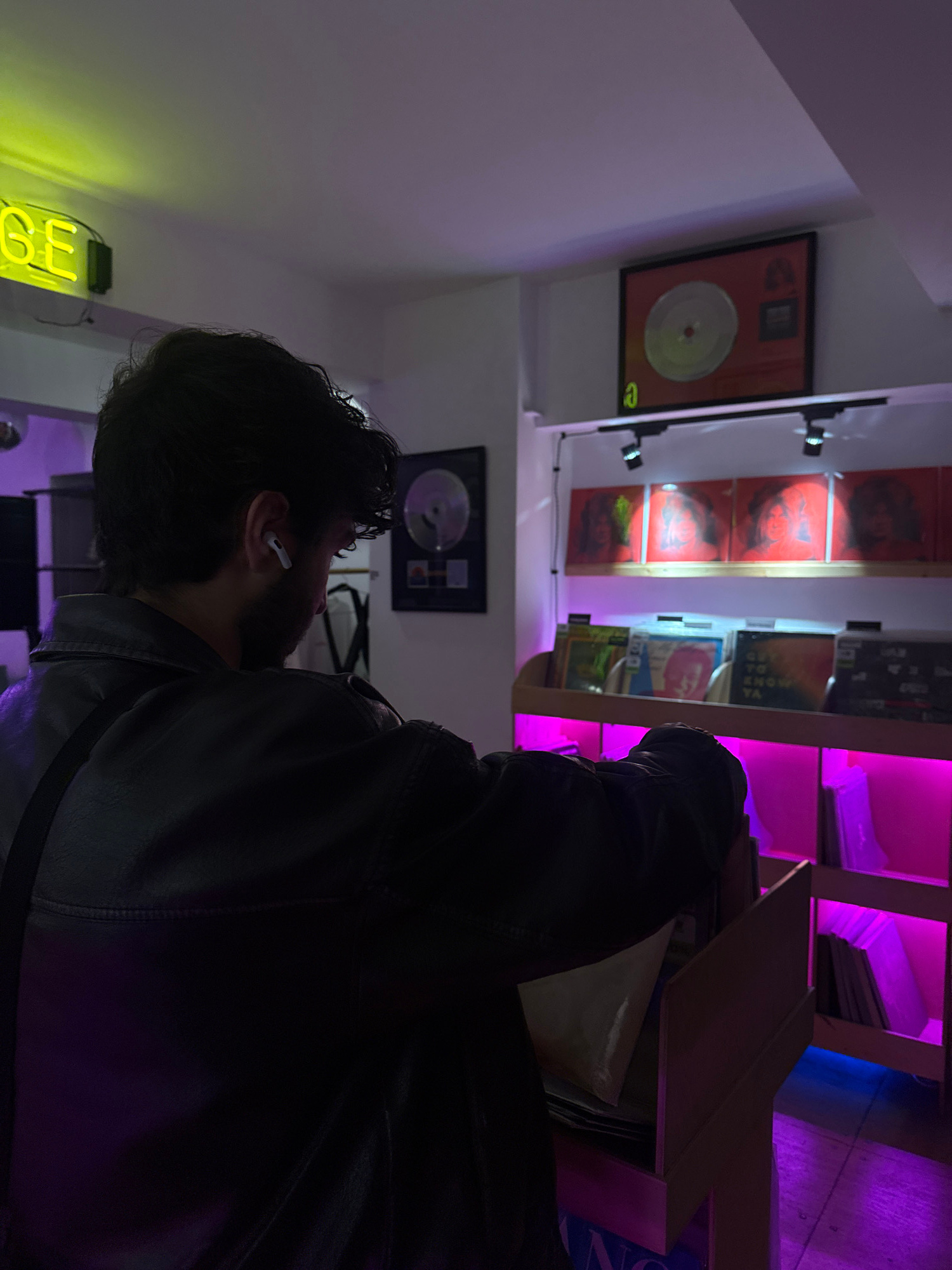 A low-angle shot reveals a man with dark hair and a beard, wearing an AirPod in his left ear and a dark jacket, standing inside a record store in Yerevan, Armenia. He is looking at a shelf of recordsβ¦read more