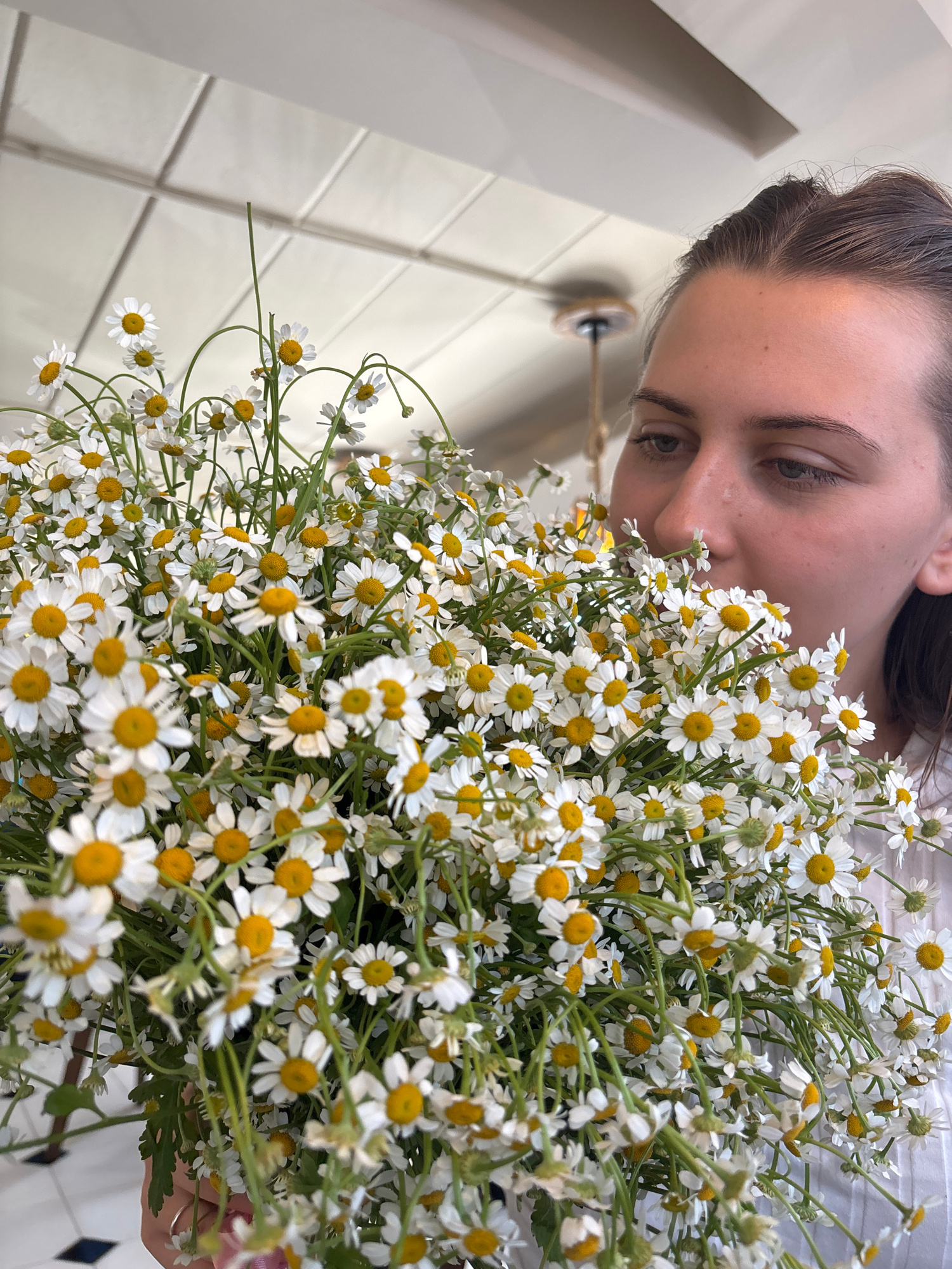 A woman is close to a bouquet of chamomile flowers with a yellow center and white petals. The woman's face is turned towards the flowers as if she might be smelling them. She has fair skin, brown hair…read more