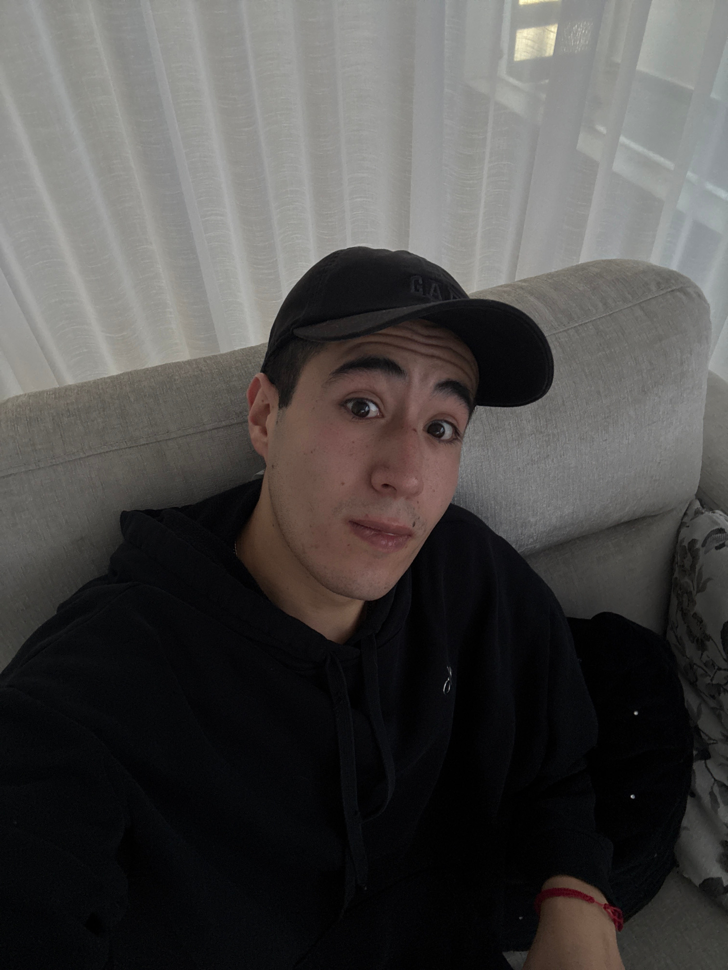A young man is depicted lying on a light grey sofa indoors, captured from a slightly elevated angle. He has dark hair, dark eyes, and a light to medium skin tone, looking directly at the camera with w…read more