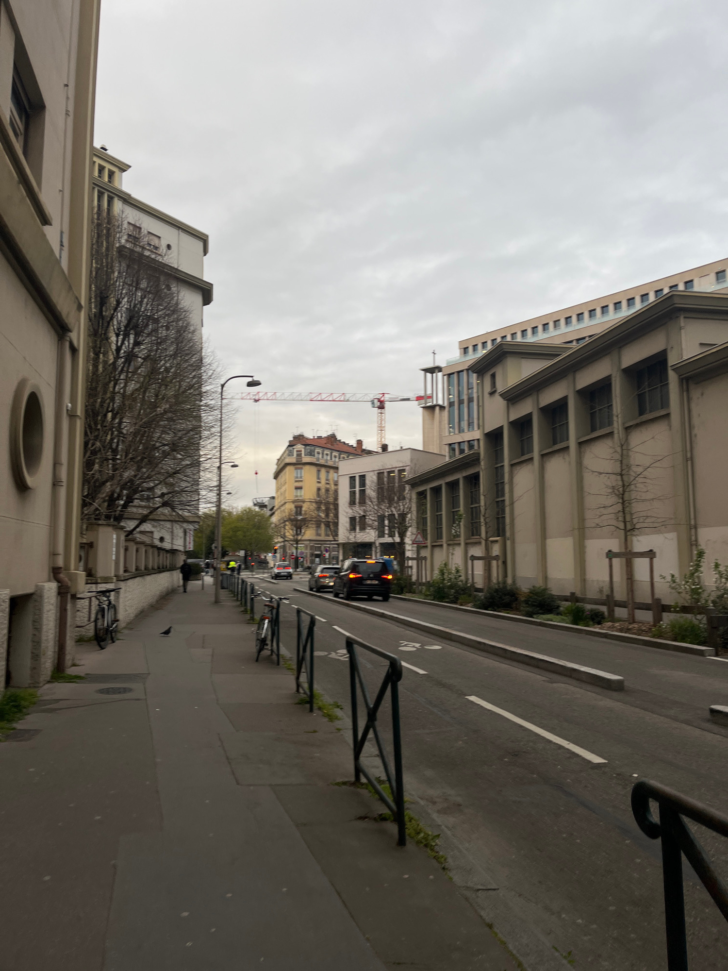 The image is a street view in Lyon, France, under a cloudy sky. The street is lined with buildings of varying heights and architectural styles. There is a crane visible in the distance. A road runs al…read more