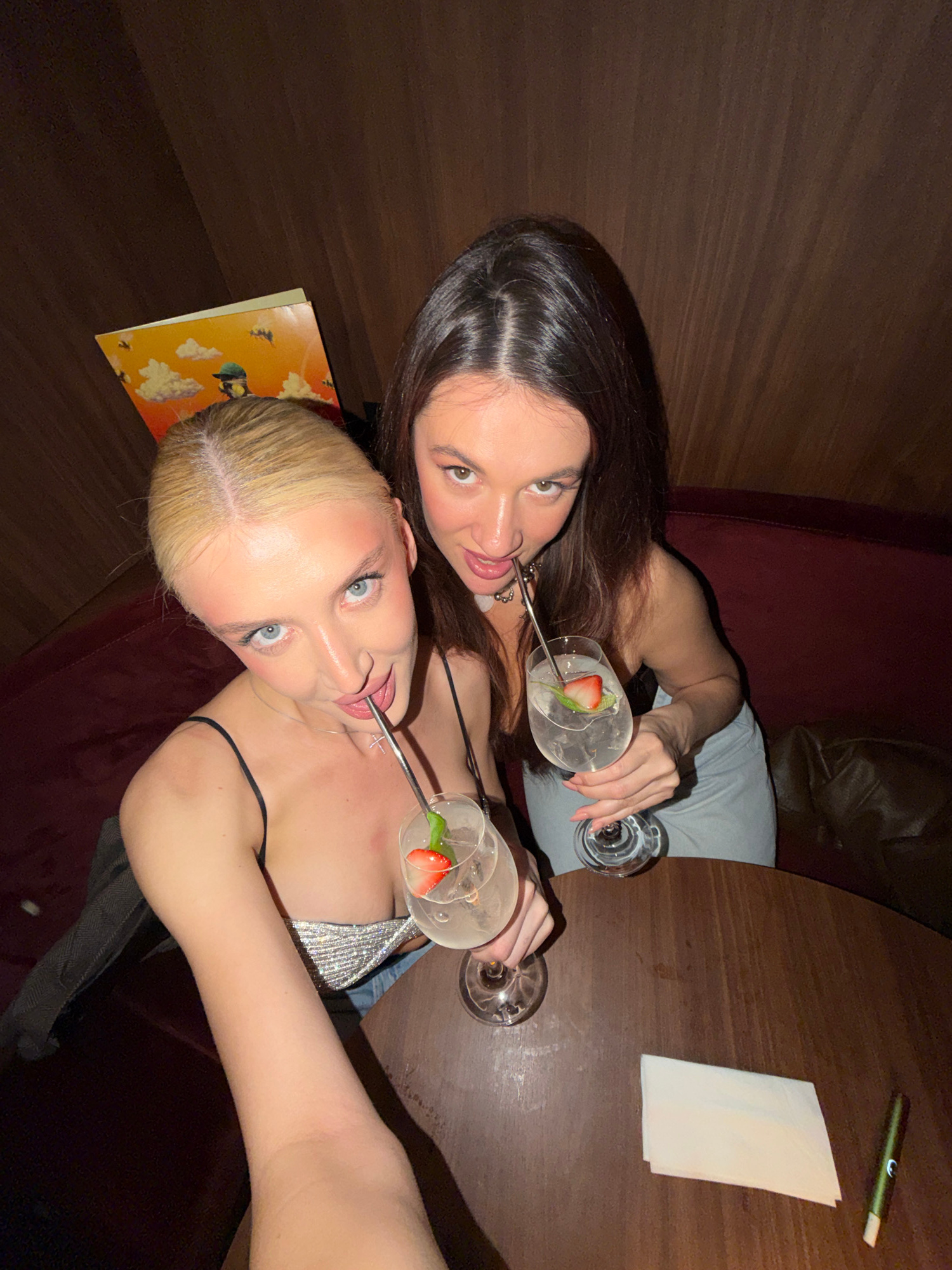 Here is a description of the image: Two women are sitting at a dark wooden table with cocktails. The woman on top has dark hair and is wearing a gray top. The woman below has blonde hair and is weari…read more