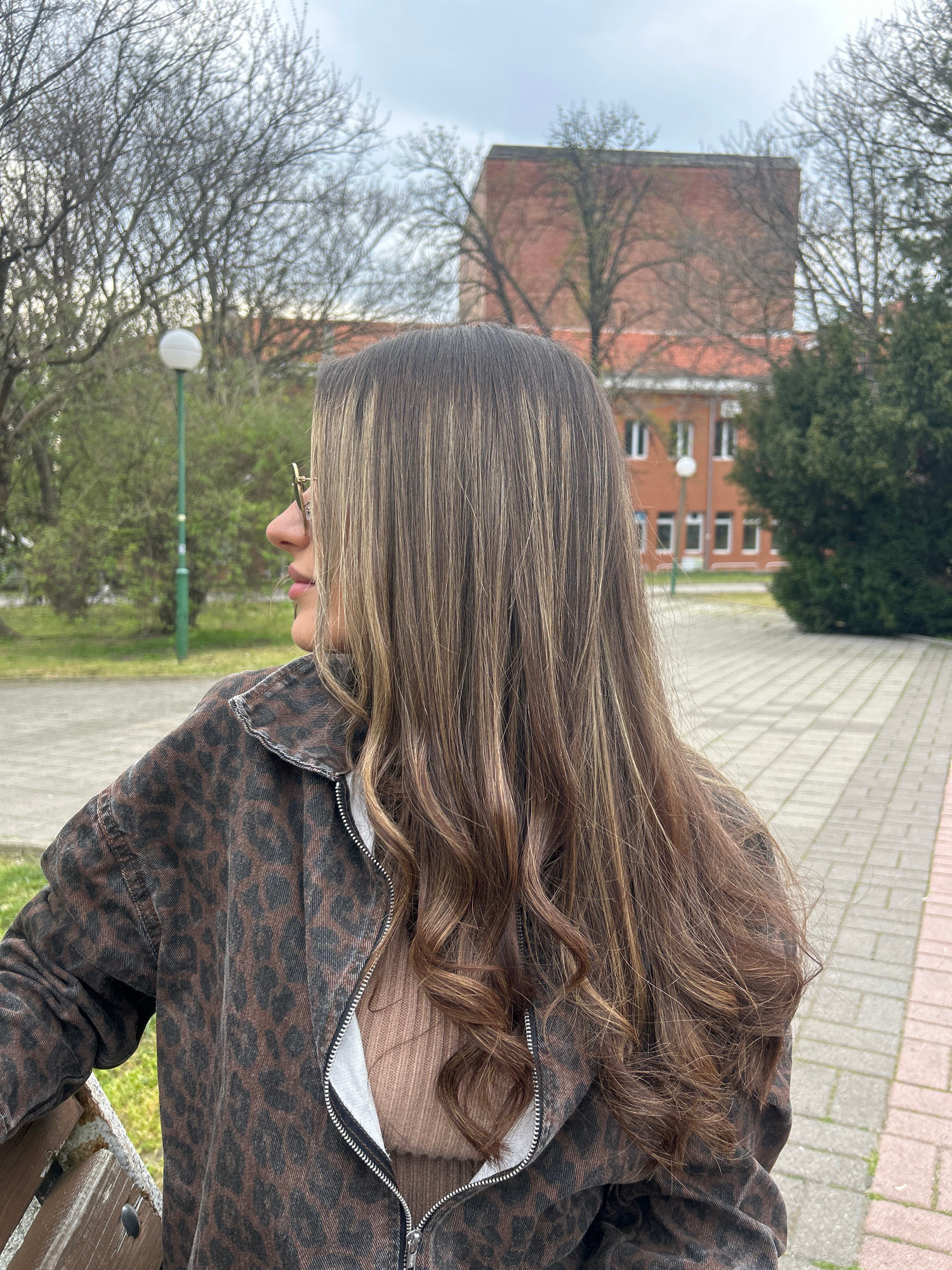 A medium shot shows a person from the shoulders up. The person has long, brown hair with blonde highlights and is wearing a brown and black animal print jacket over a brown top. They are wearing glass…read more