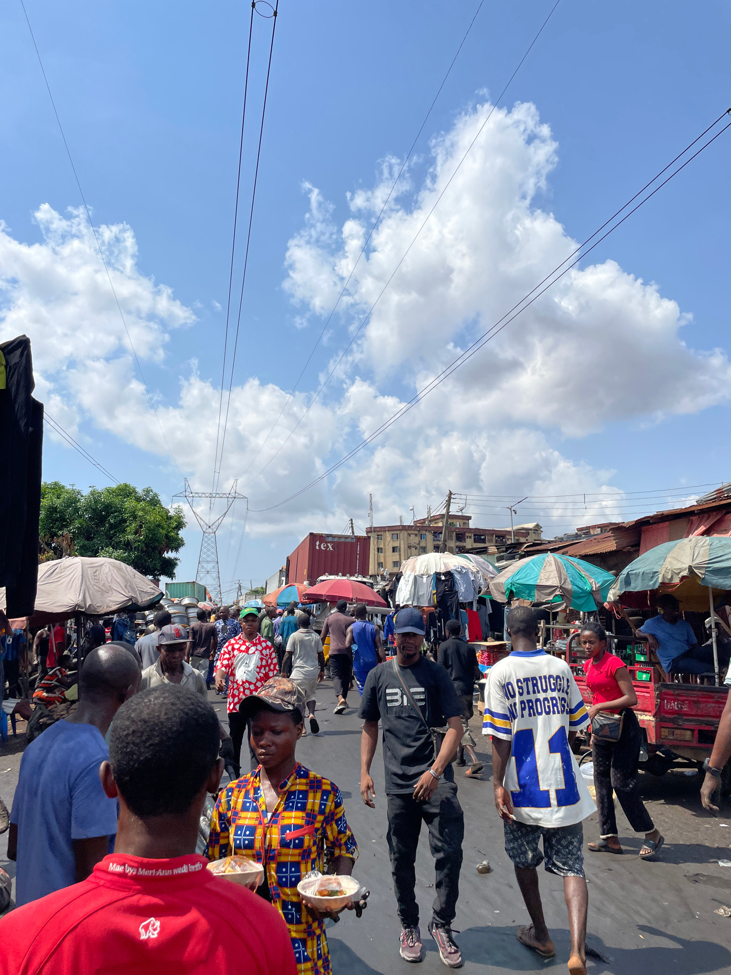 This media file captures a vibrant and busy street market scene in Onitsha, Nigeria, under a bright, sunny sky with scattered white clouds. The image, taken in daylight (likely midday or early afterno…read more
