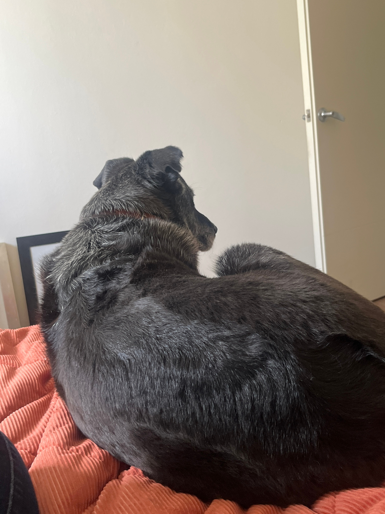 A medium-sized, black dog is lying curled on an orange corduroy blanket. The dog's head is visible on the left side of the frame, facing towards the top left. A dark picture frame is partially visible…read more