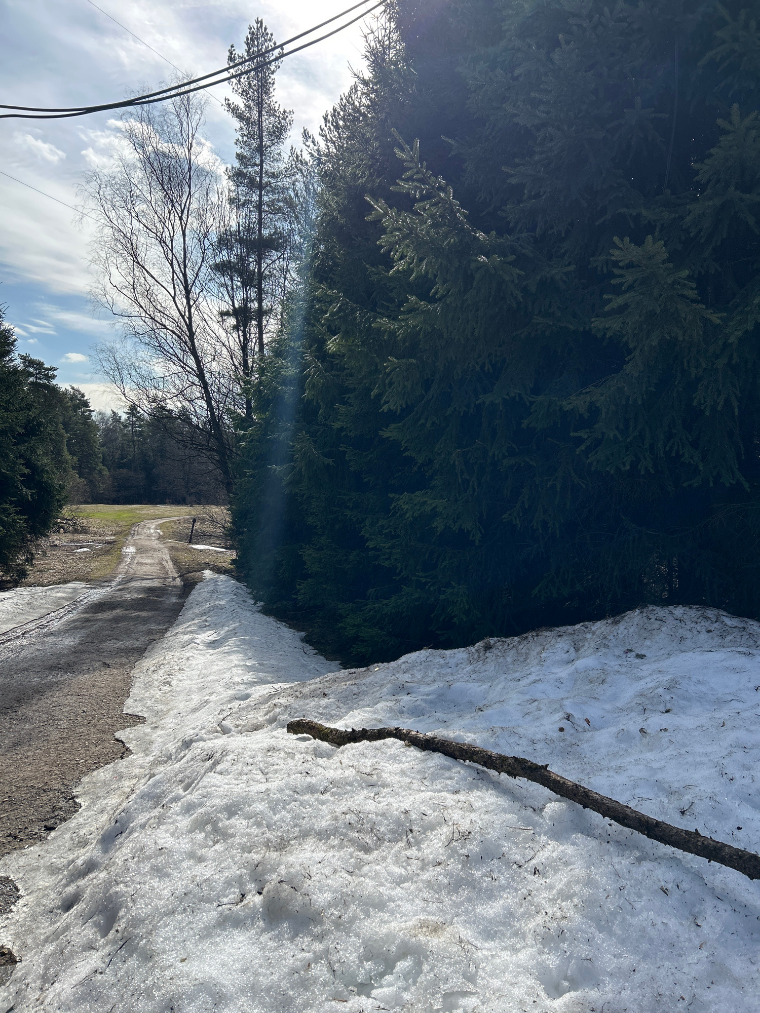 The image shows a snow-lined road in a wooded area. On the right, a bank of melting snow is visible, with a fallen branch resting on its surface. The road itself appears muddy in places. To the left o…read more