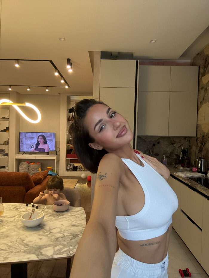 The scene depicts an interior view of a modern apartment located in Khimki, Russia, captured from a selfie perspective. In the foreground, a woman with dark hair, styled in a partial updo, and full ma…read more