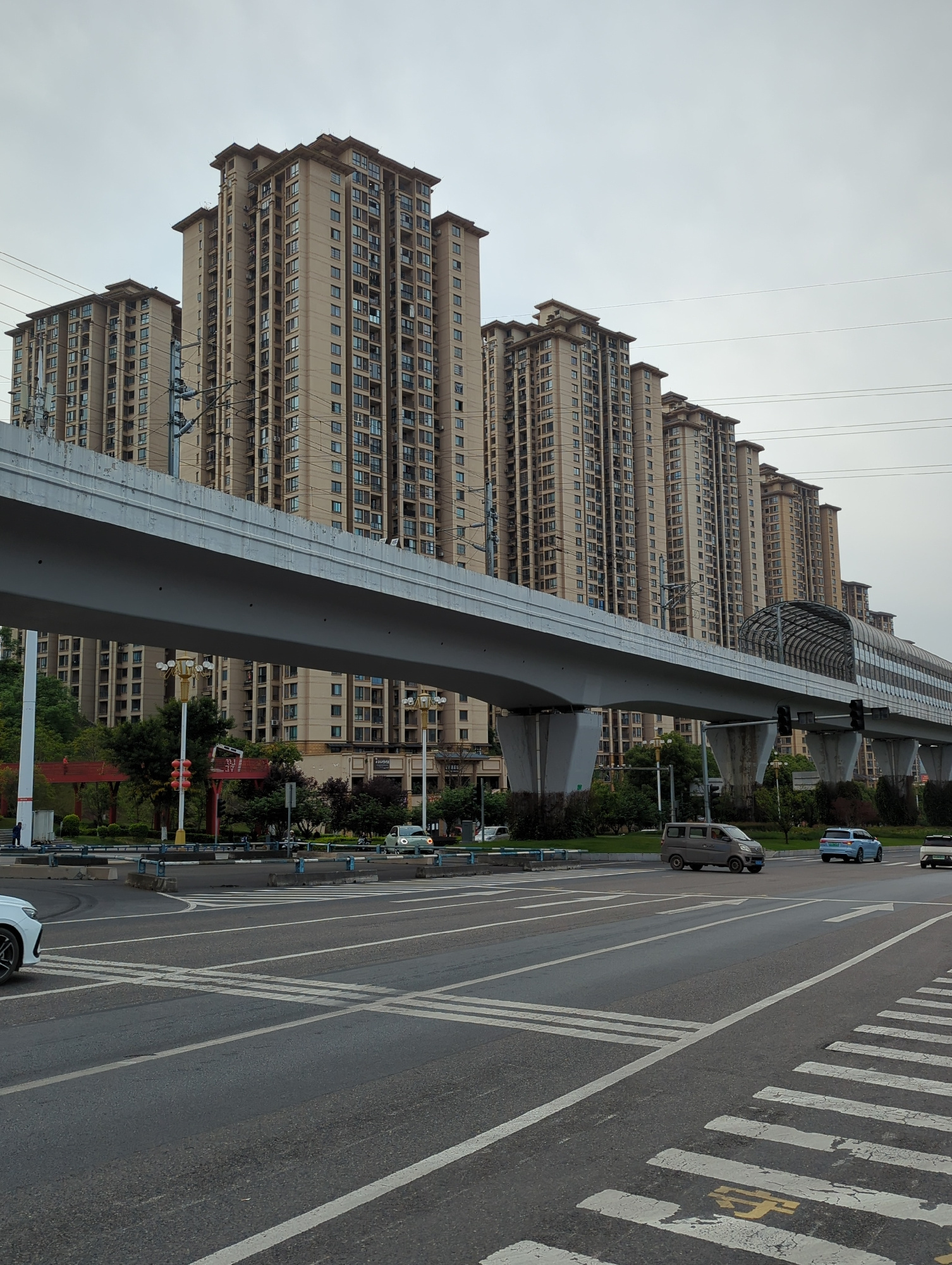 The image displays a modern urban landscape in Jiangjin, China, featuring towering residential buildings, an elevated transit system, and a multi-lane road under an overcast sky. On the left, multipl…read more