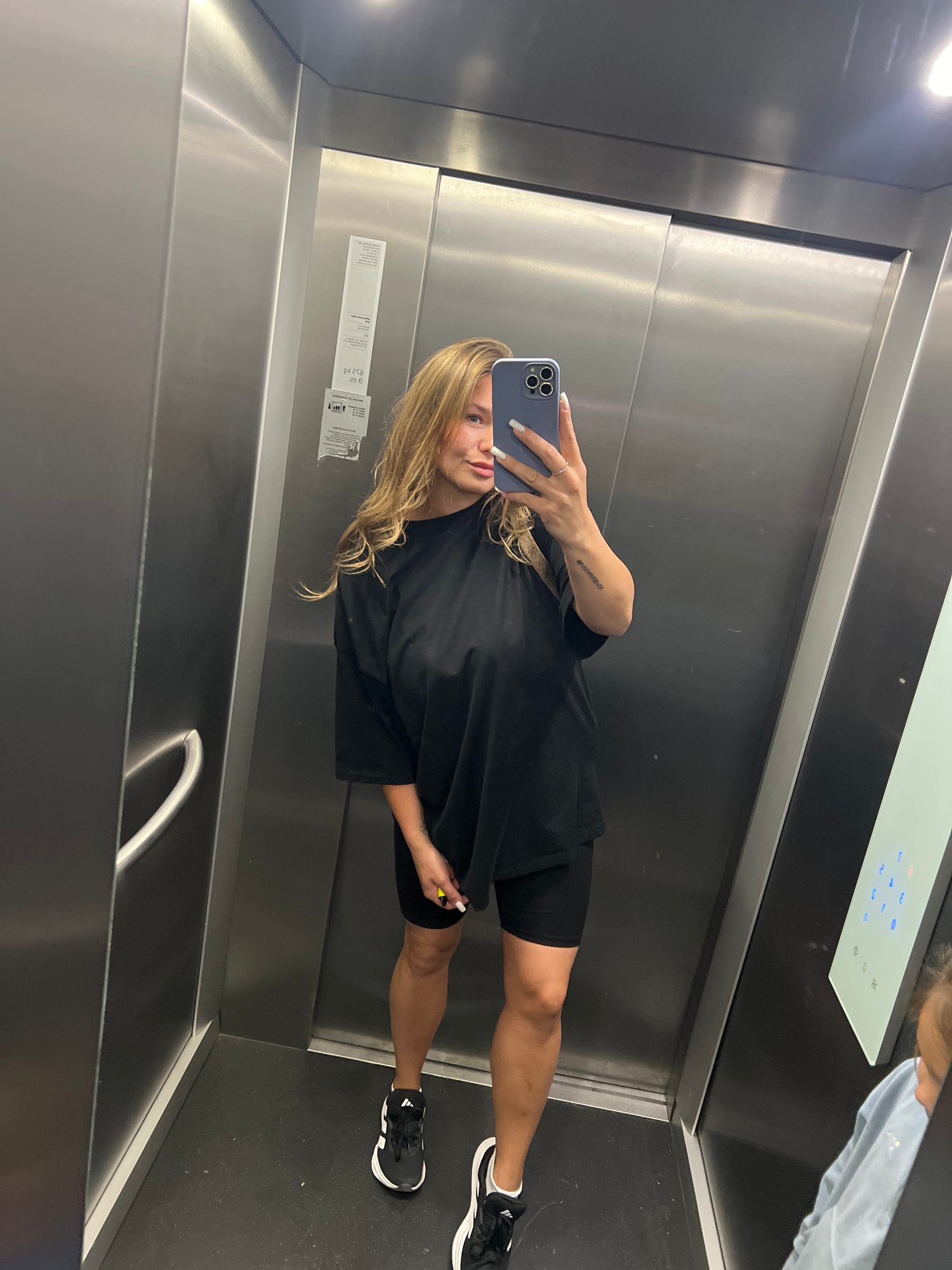 A fair-skinned young woman with blonde hair is taking a selfie in an elevator. She is wearing a black oversized T-shirt and black shorts, with black and white sneakers. She holds a blue smartphone wit…read more