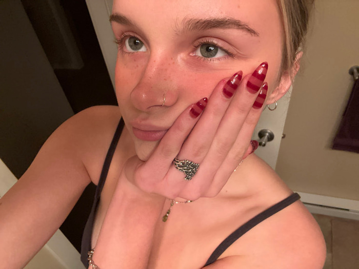 A selfie, rotated 180 degrees, features a person with gray-green eyes and fair skin. They have a nose piercing and freckles. Their nails are long and painted with clear polish and dark red horizontal…read more