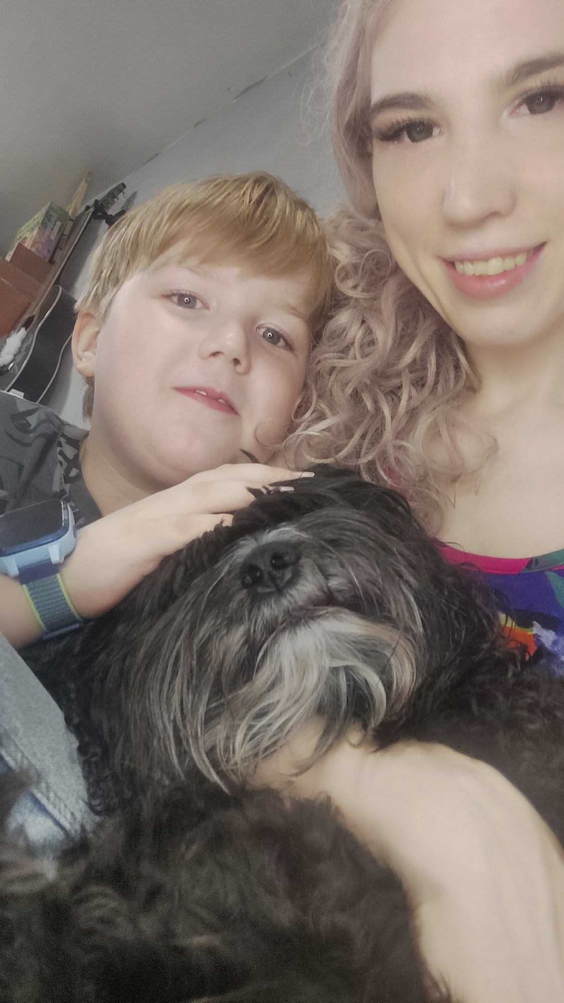 A close-up shot depicts two people and a dog in an indoor setting. One individual has light blond hair, light skin, and is wearing a grey patterned shirt and a blue smartwatch on their left wrist. The…read more