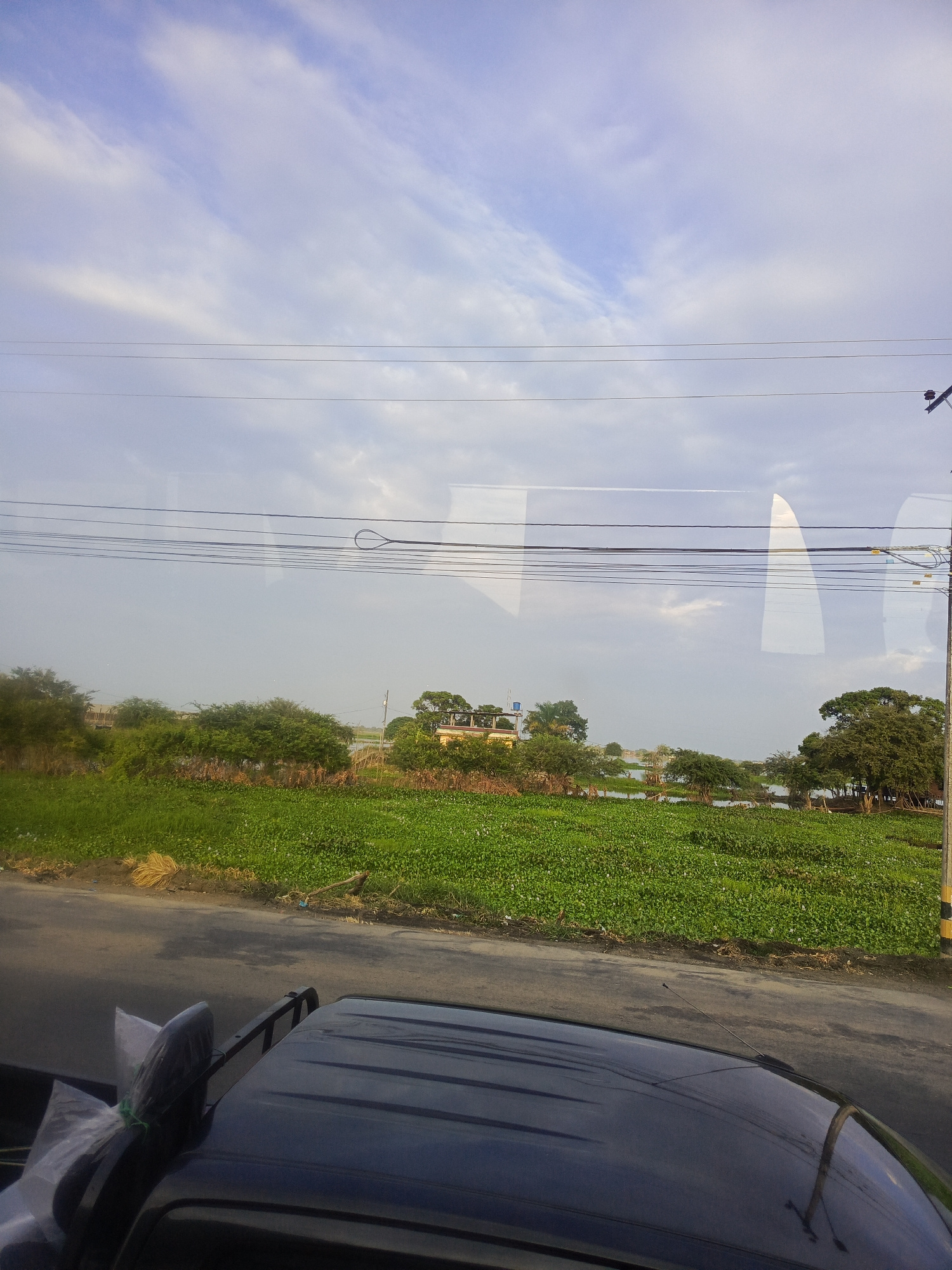 The image shows a view from inside a vehicle, likely a car, looking out towards a landscape in Babahoyo, Ecuador. The sky is overcast with scattered clouds. Power lines stretch across the upper portio…read more
