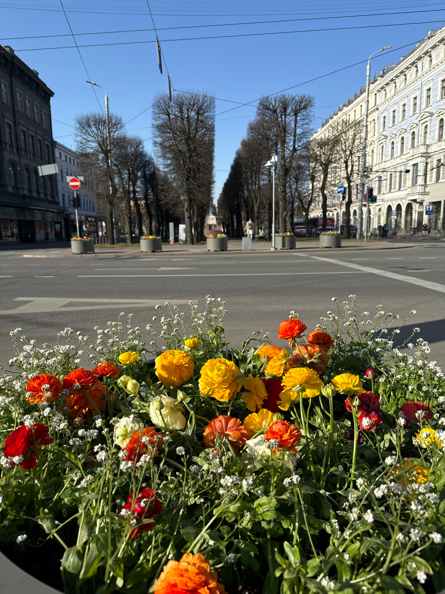 The image shows a street scene in Riga, Latvia. In the foreground, a flower bed with colorful ranunculus and baby's breath flanks the right side of the frame. The street, a wide asphalt thoroughfare,…read more