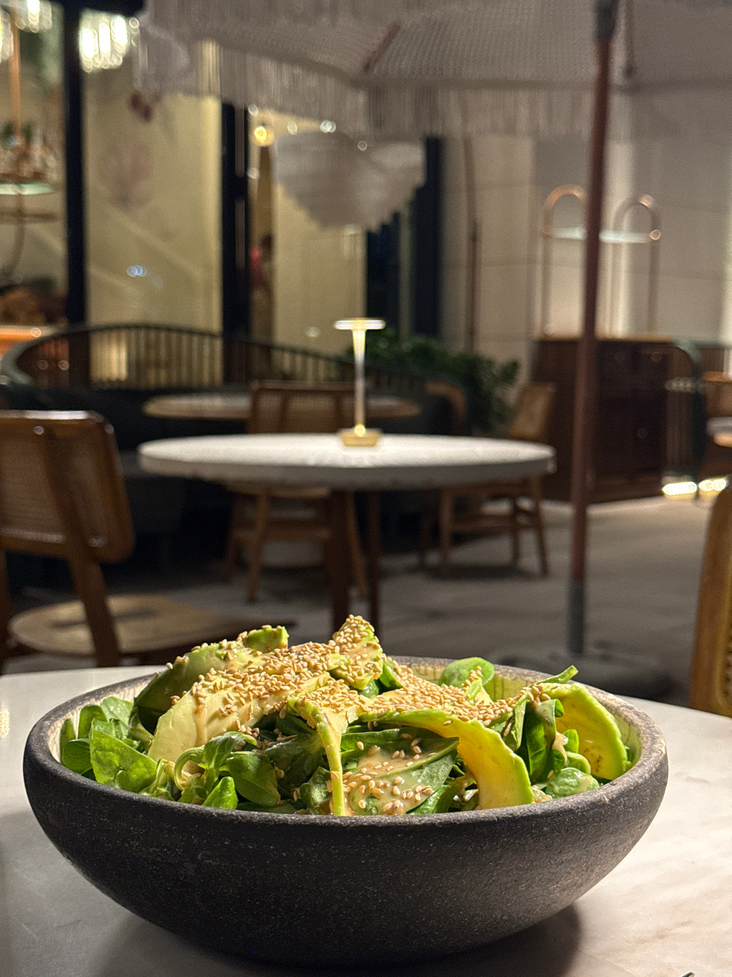 A close-up, indoor shot captures a salad in a dark bowl, positioned on a light surface. The salad consists of green leaves, avocado, and sesame seeds. In the blurred background, there are tables, chai…read more