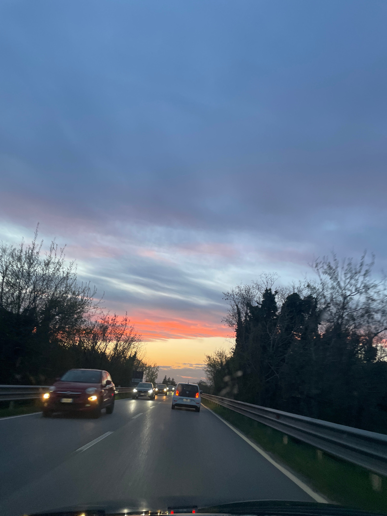 The image captures a view from a moving vehicle, likely on a highway, in San Giovanni al Natisone, Italy, at dusk. The sky displays a gradient of colors, from a deep blue at the top to hues of pink, o…read more