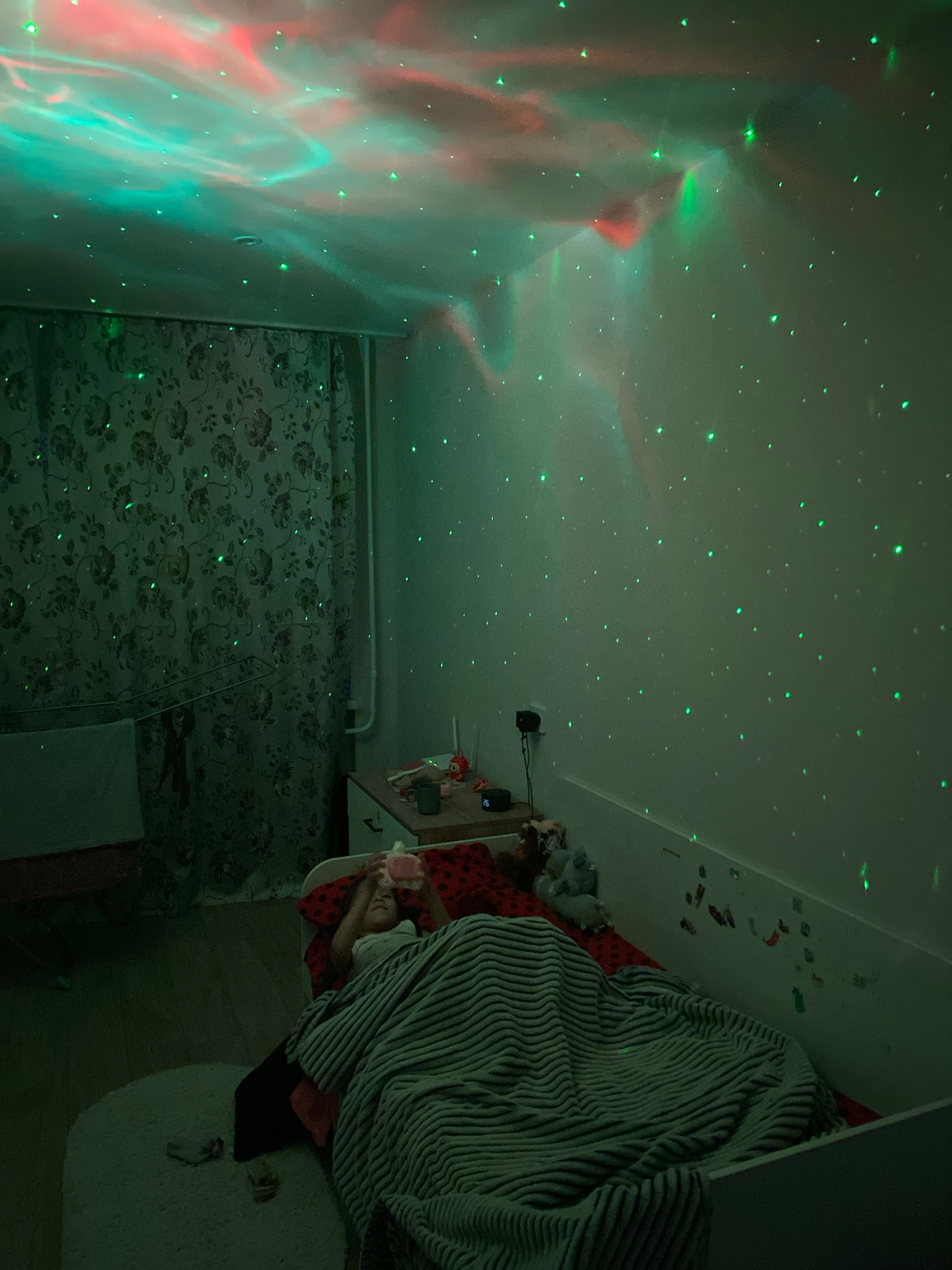 A dimly lit bedroom in Chaikovsky, Russia. The ceiling is covered in green star-shaped lights and swirling aurora-like projections in red and green. Wallpaper with a dark floral pattern covers one wal…read more
