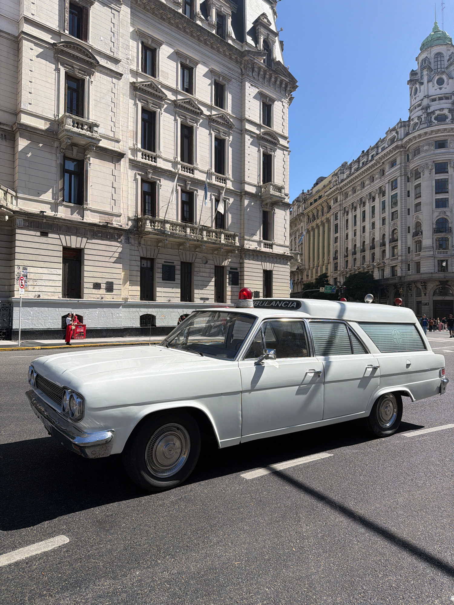 A white ambulance with the word "AMBULANCIA" written on its side is parked on a street in Buenos Aires, Argentina. Two red garbage bins and two people in red and white uniforms stand behind the ambulaβ¦read more