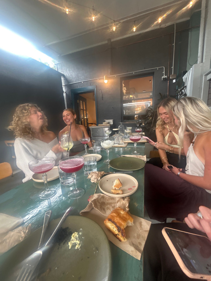 A tilted view shows a table covered with plates, empty glasses, and remnants of food. Two women are visible at the top of the frame, one fair-haired and the other with dark hair. Two other women are v…read more