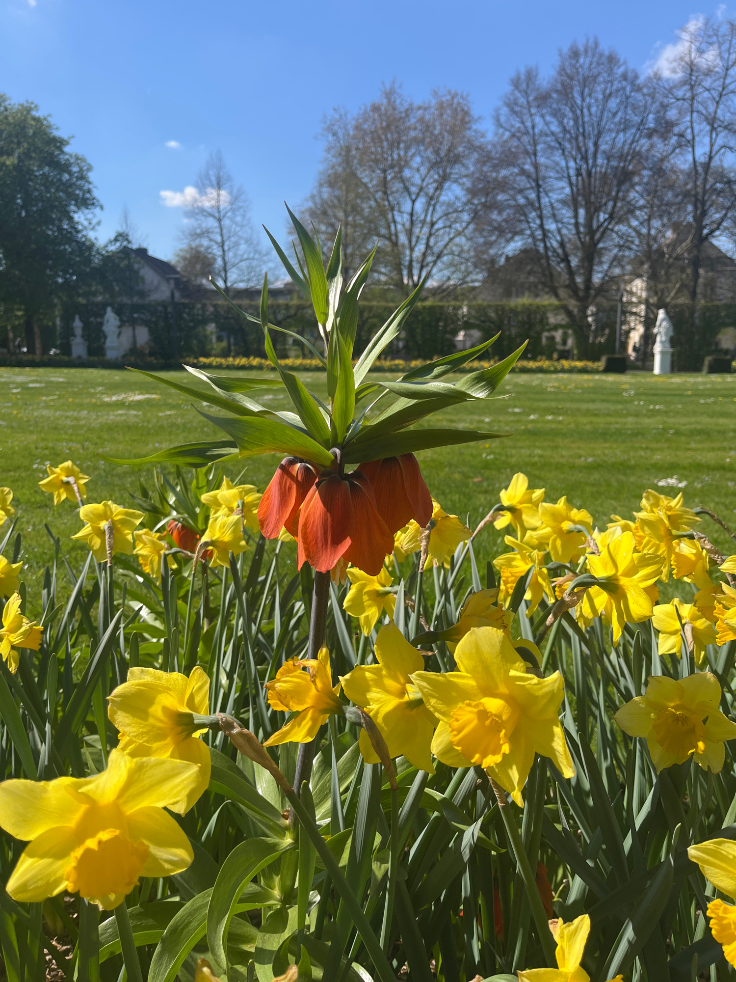 The image captures a close-up of spring flowers in Trier, Germany. Bright yellow daffodils are the dominant feature in the foreground, densely packed with green foliage. Among them, a singular orange…read more
