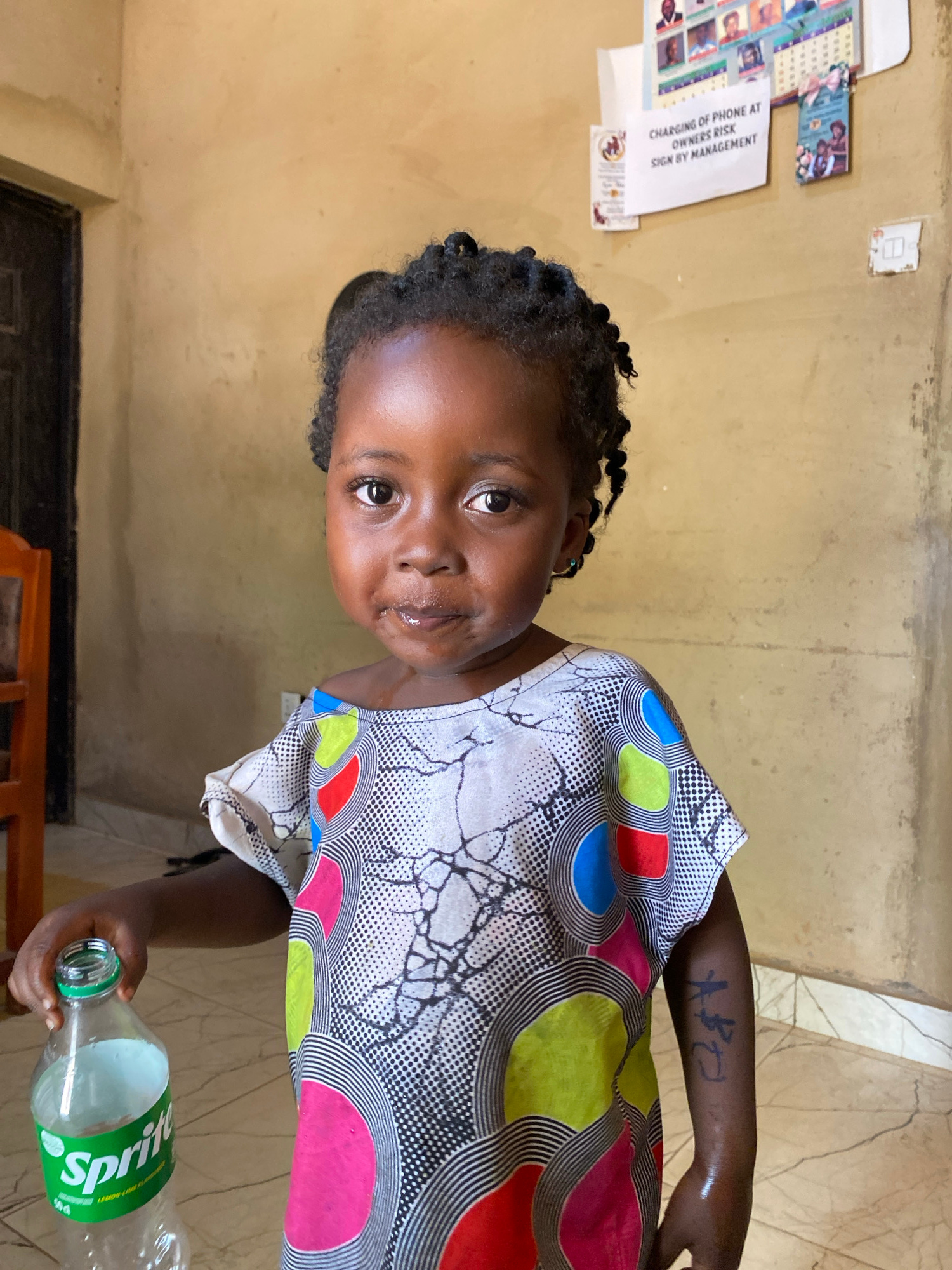 A young Black child with dark braided hair is depicted indoors in Kuru Dungus, Nigeria. The child wears a vibrant, colorful dress featuring a pattern of large circles in blue, red, yellow, and pink on…read more