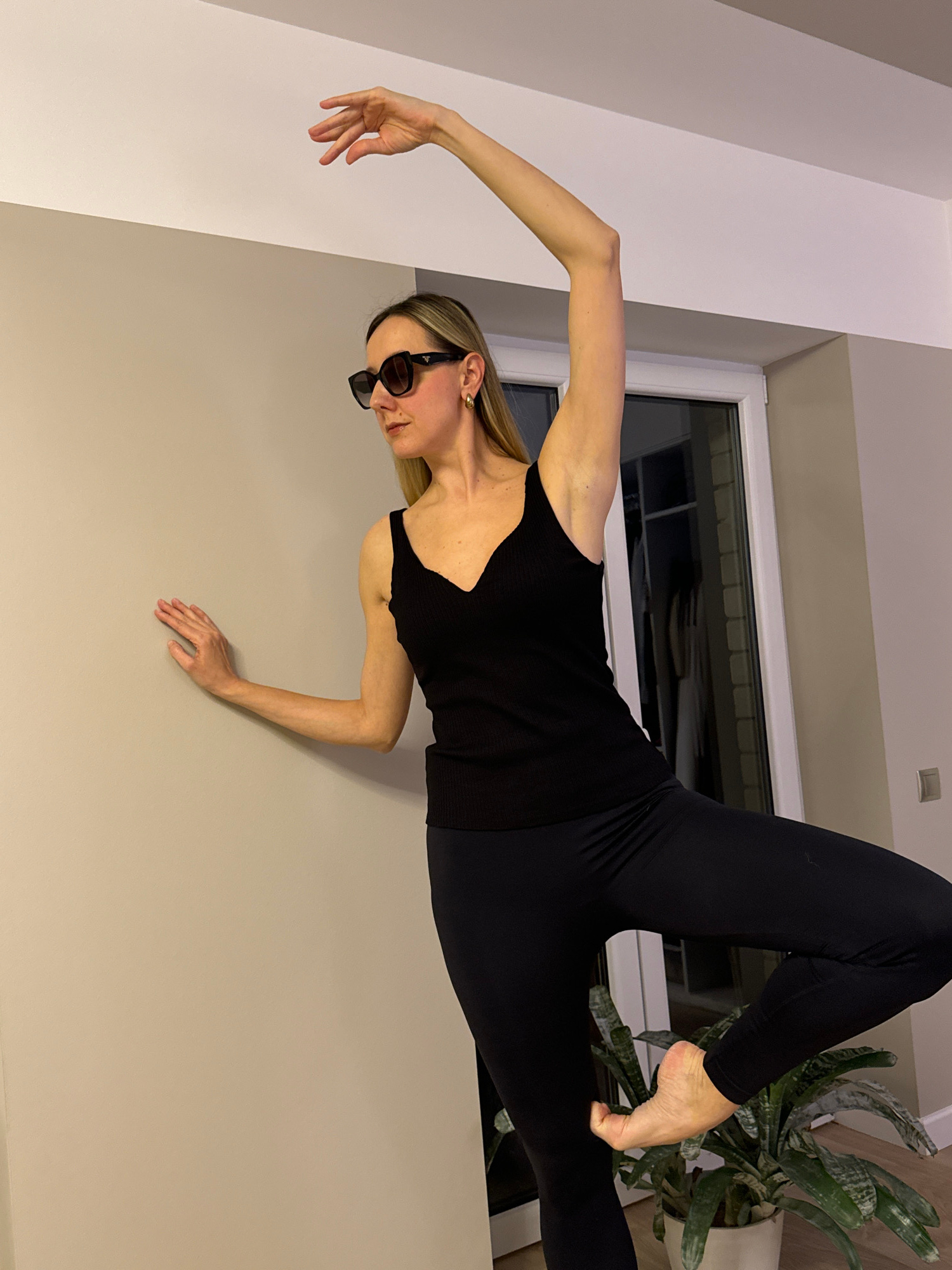 A woman in black leggings and a black tank top is shown in an indoor setting. She is also wearing sunglasses. A houseplant is visible in the background near a window. The location is not discernible a…read more