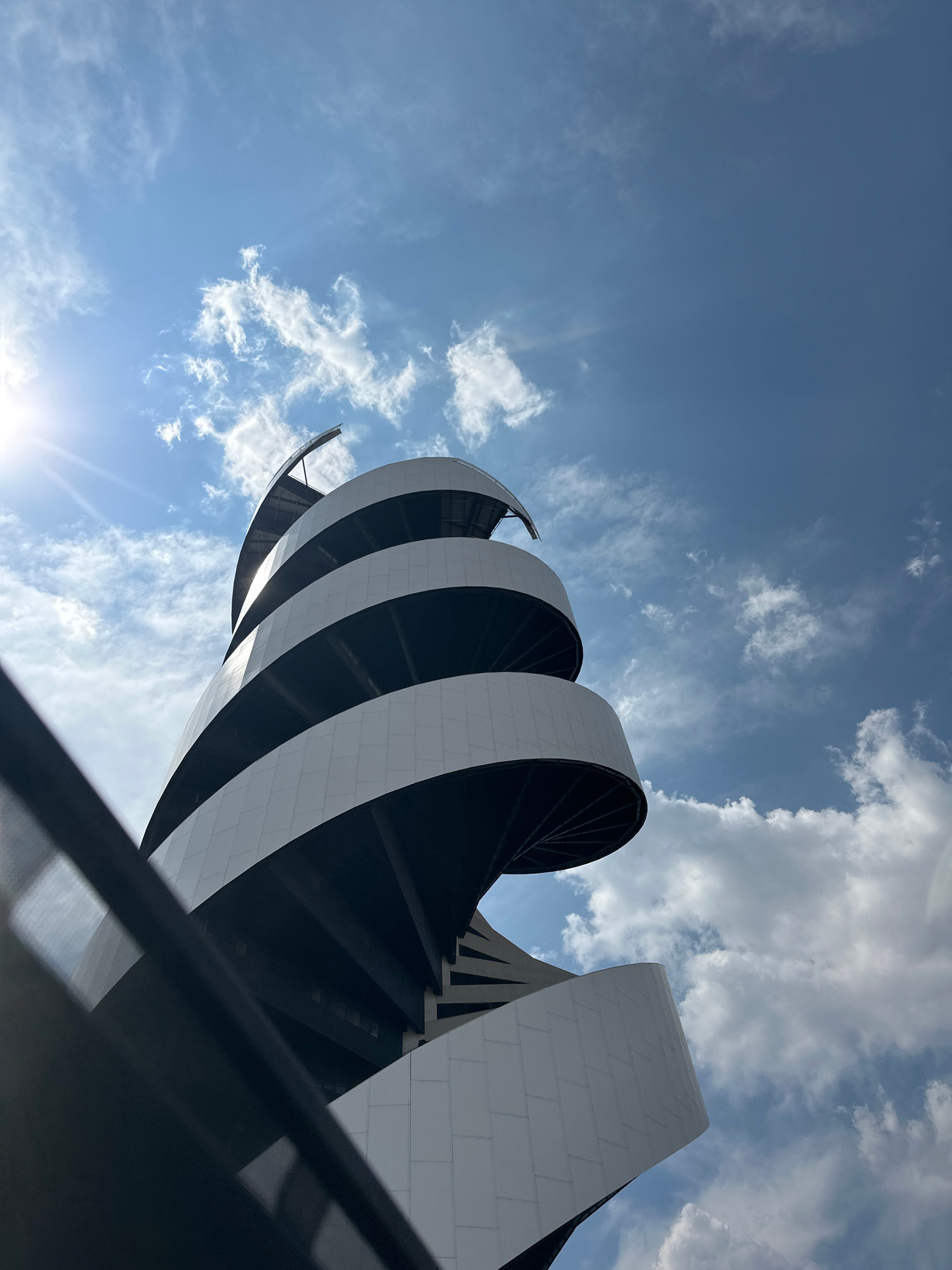 This is a low-angle architectural photograph showing a section of a building with a distinctive, repeating curved or spiral design. The structure consists of a series of white and dark-colored segment…read more