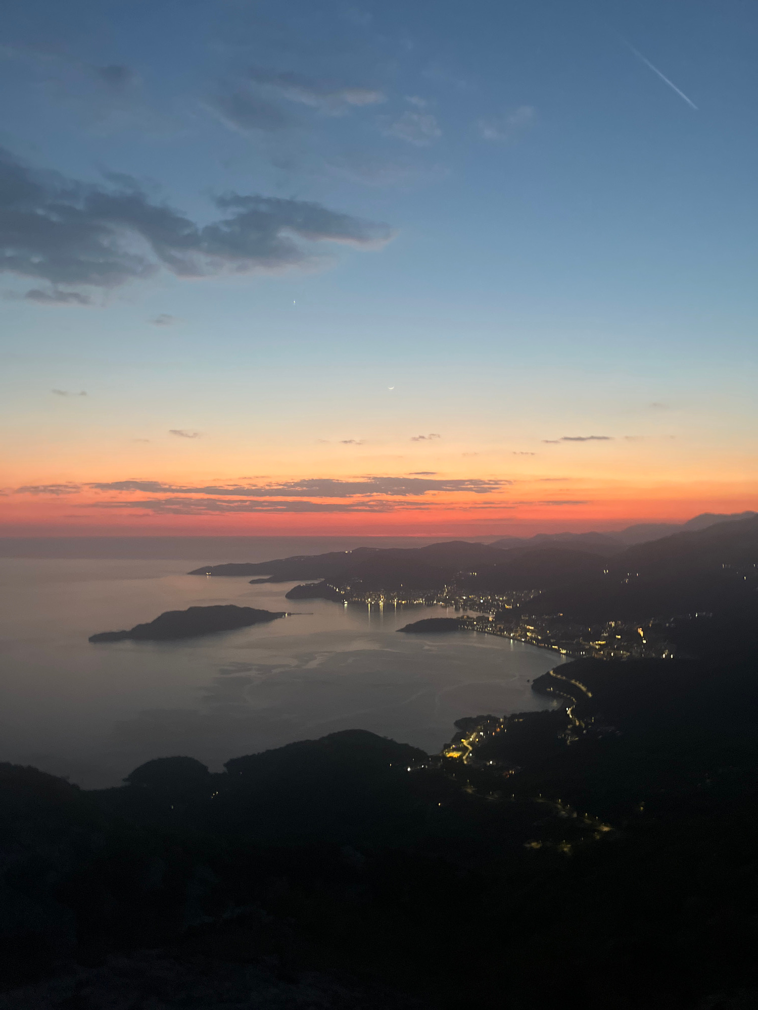 The image depicts a sunset scene in Čelobrdo, Montenegro. The sky transitions from blue with scattered clouds on the left to orange and red hues near the horizon in the center. A faint crescent moon i…read more