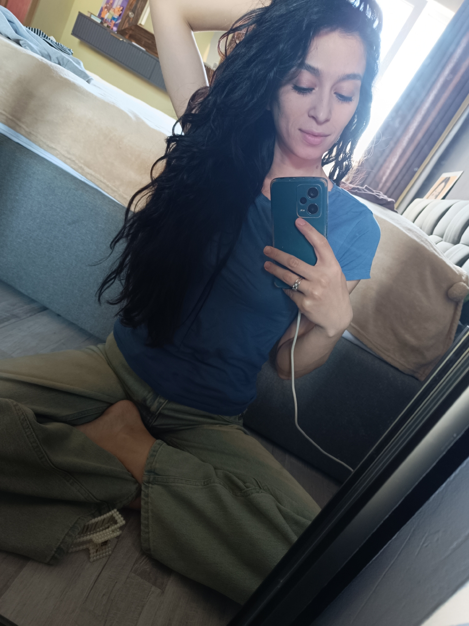 A woman is sitting cross-legged on a floor, taking a selfie with a green smartphone. She has long, dark curly hair and is wearing a blue t-shirt and green pants. A white charger cable is connected to…read more