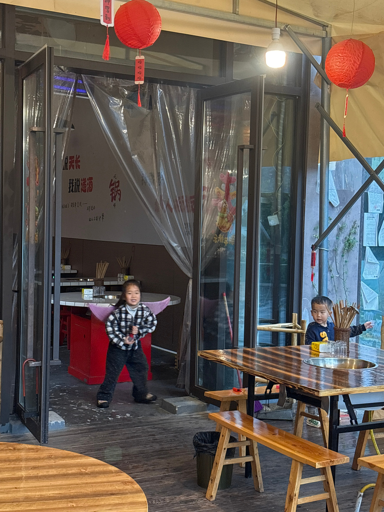 Here is a detailed description of the image: **Setting:** The image appears to be taken inside or in front of a restaurant in Jiangjin, China. Red lanterns hang from the ceiling, adding a festive tou…read more