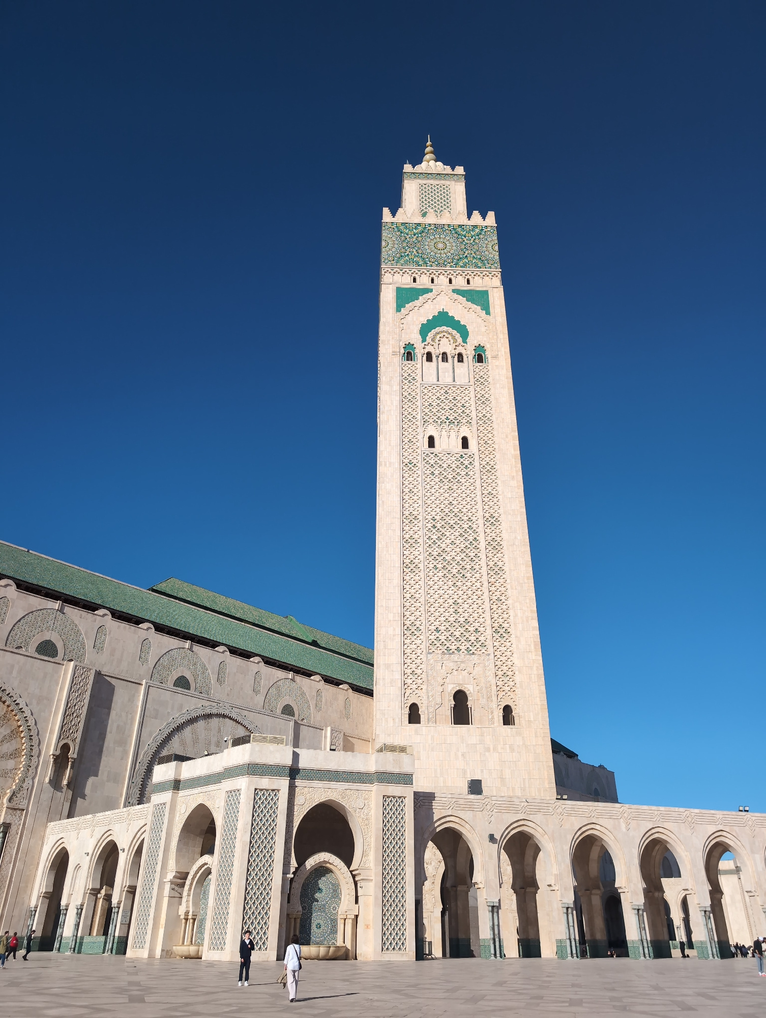 The image shows the Hassan II Mosque in Casablanca, Morocco. The minaret dominates the frame, rising against a clear blue sky. The mosque's structure is visible, showcasing intricate patterns and arch…read more