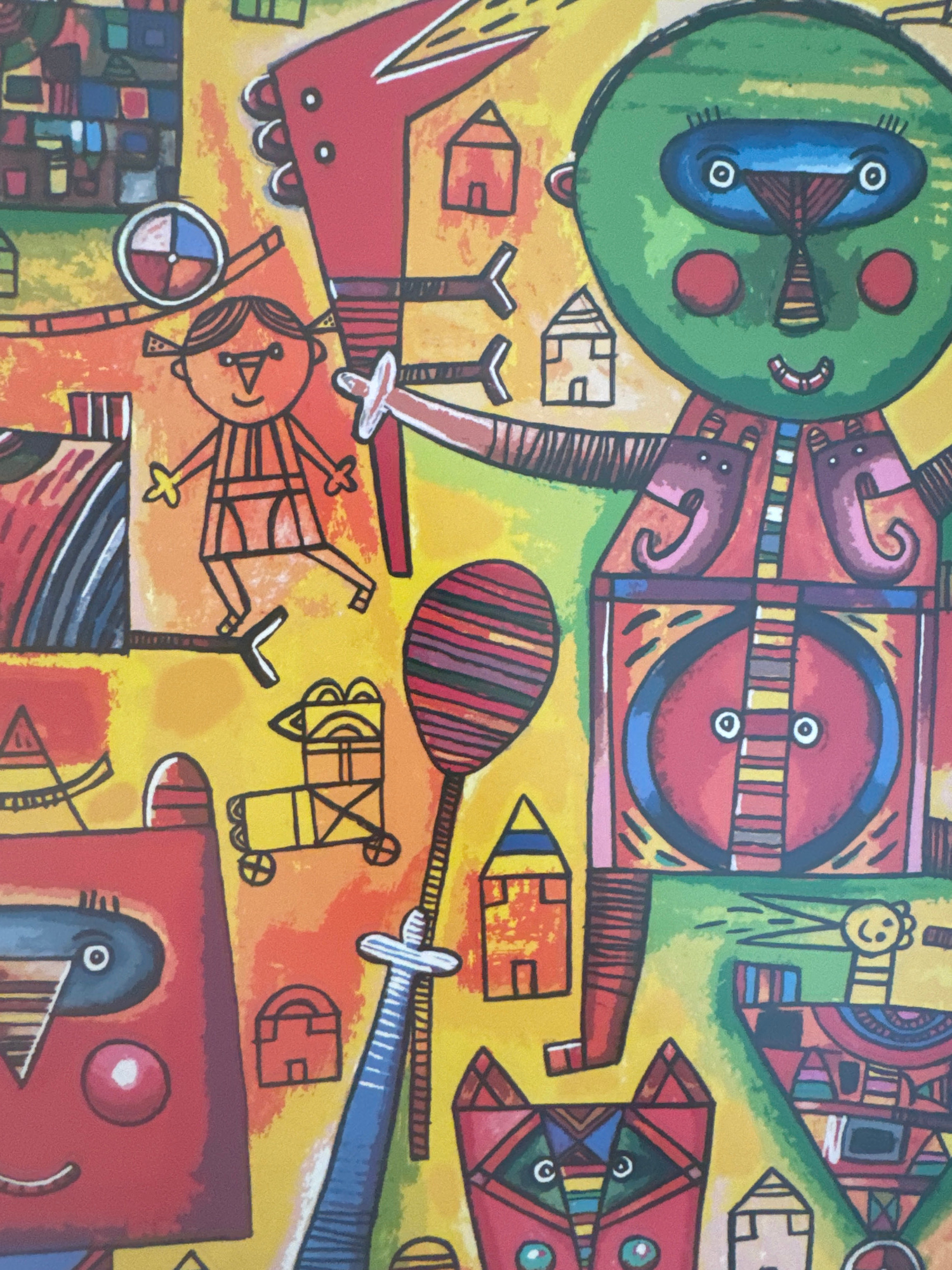 The image depicts a colorful, surreal painting. Dominant colors are red, yellow, green, and blue. The style is abstract with elements reminiscent of folk art. Several figures are depicted: * A green-…read more