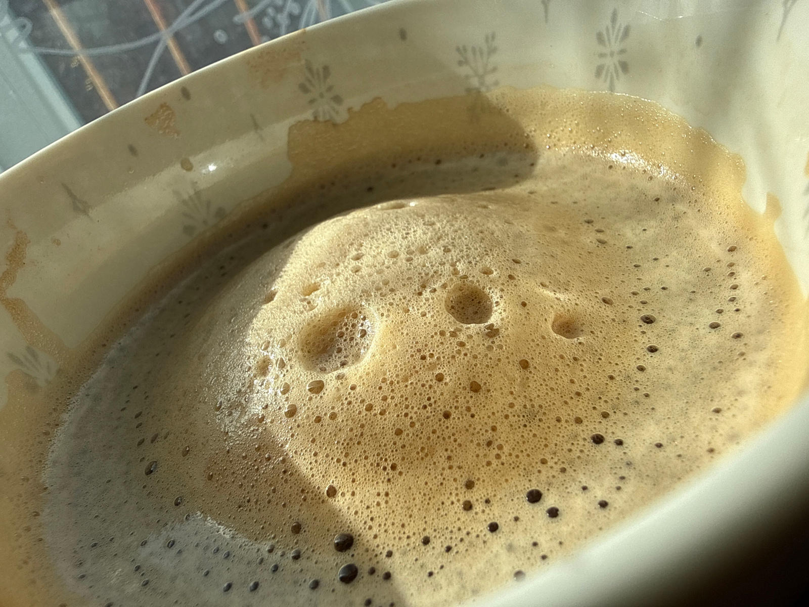 The image shows a close-up of a coffee drink with a frothy surface in a white bowl. The bowl has a pattern of small, grey floral designs. The coffee is light brown with a foam layer of varying bubble…read more