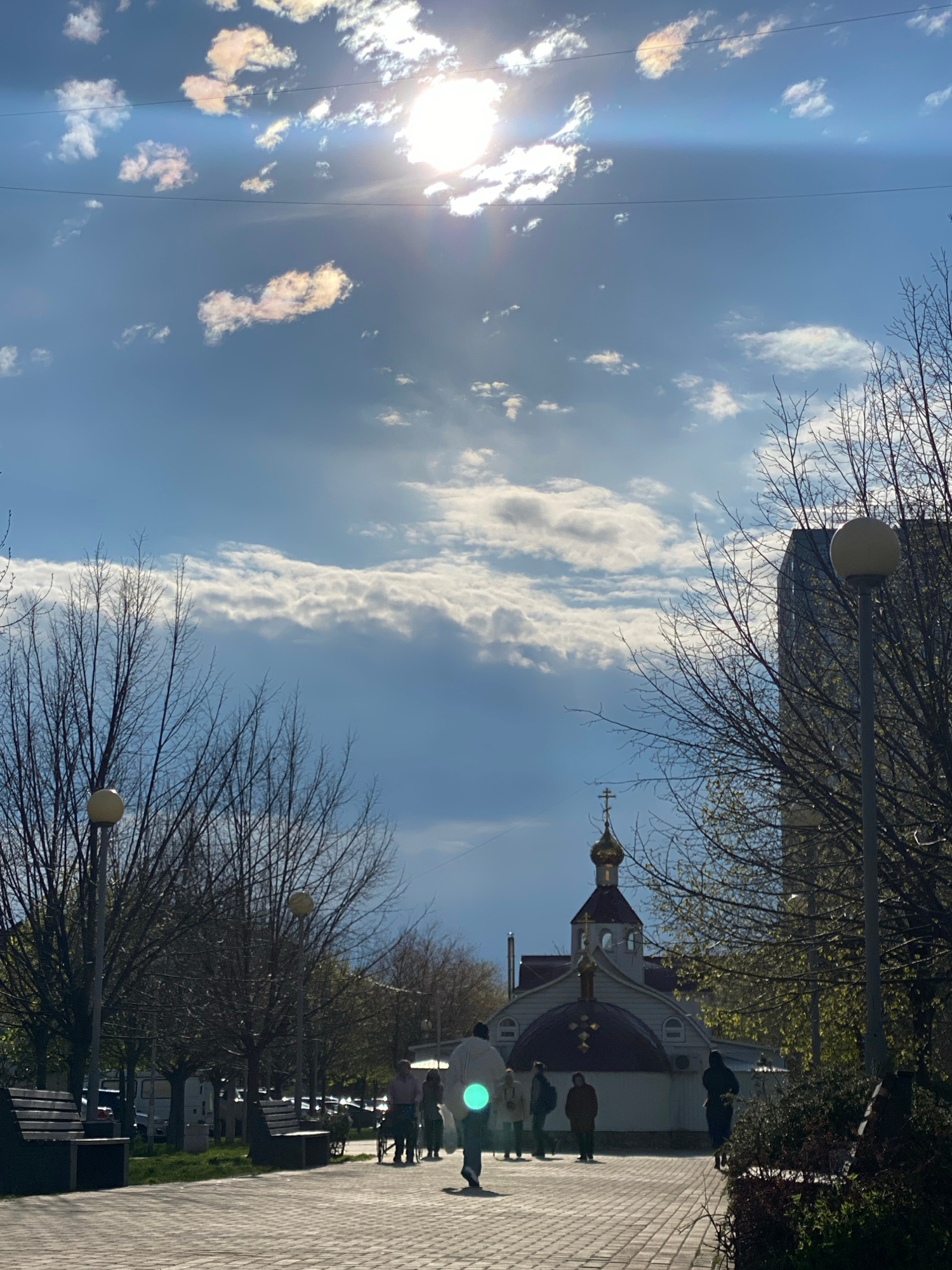 The image shows a street scene in an unknown city. A church with a golden dome and red roof is visible on the right side of the frame, with people standing near the entrance. Bare trees line the stree…read more