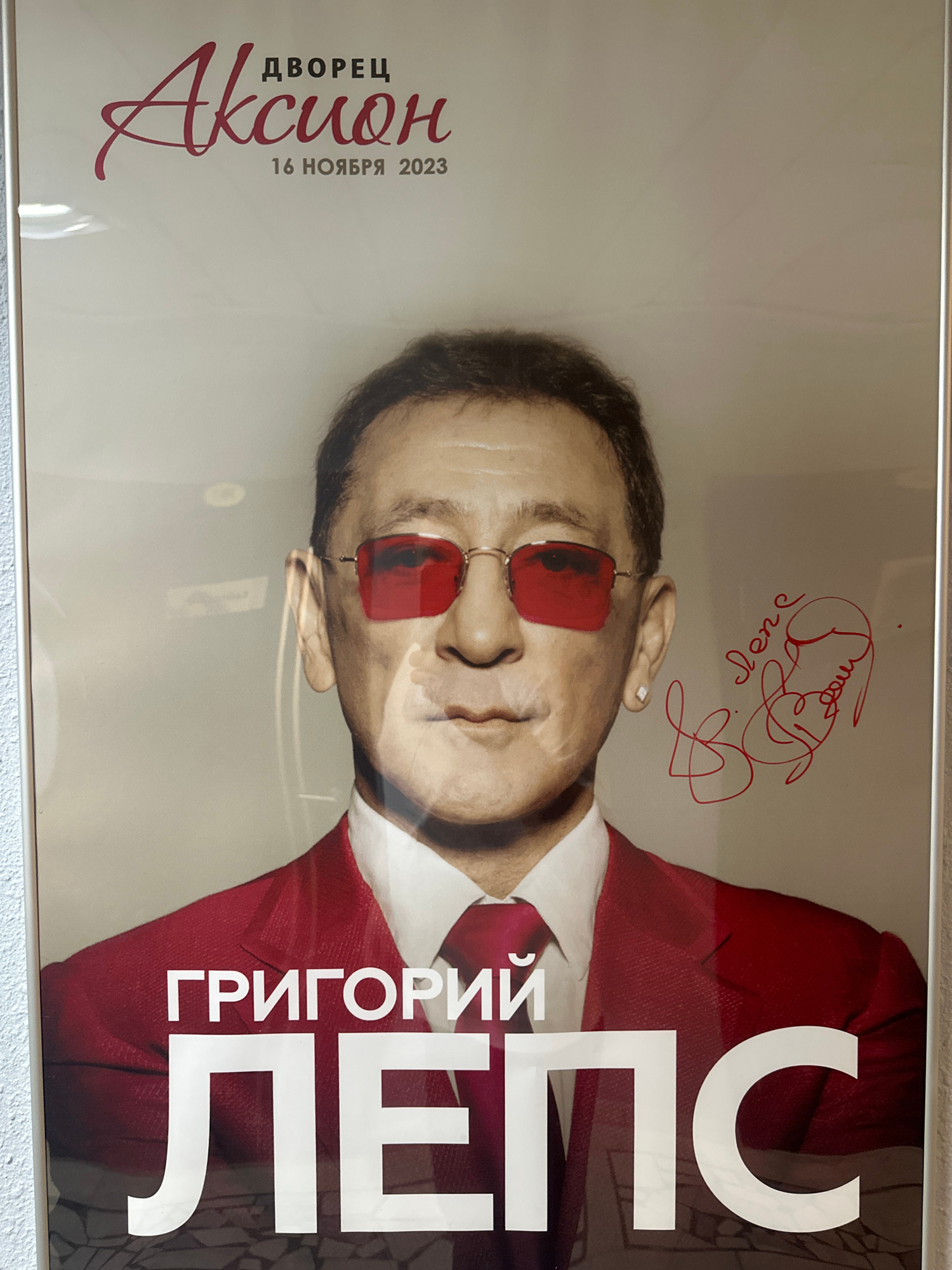 The image shows a framed poster for a Grigory Leps concert, held at the "Aksion" Palace in Izhevsk, Russia, on November 16, 2023. The poster features an image of Grigory Leps wearing red sunglasses an…read more
