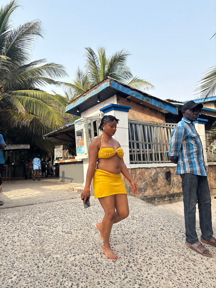A woman in a yellow two-piece outfit stands on a concrete surface next to a building with palm trees. She is holding a cell phone in her left hand. Another person, wearing a plaid shirt and dark pants…read more