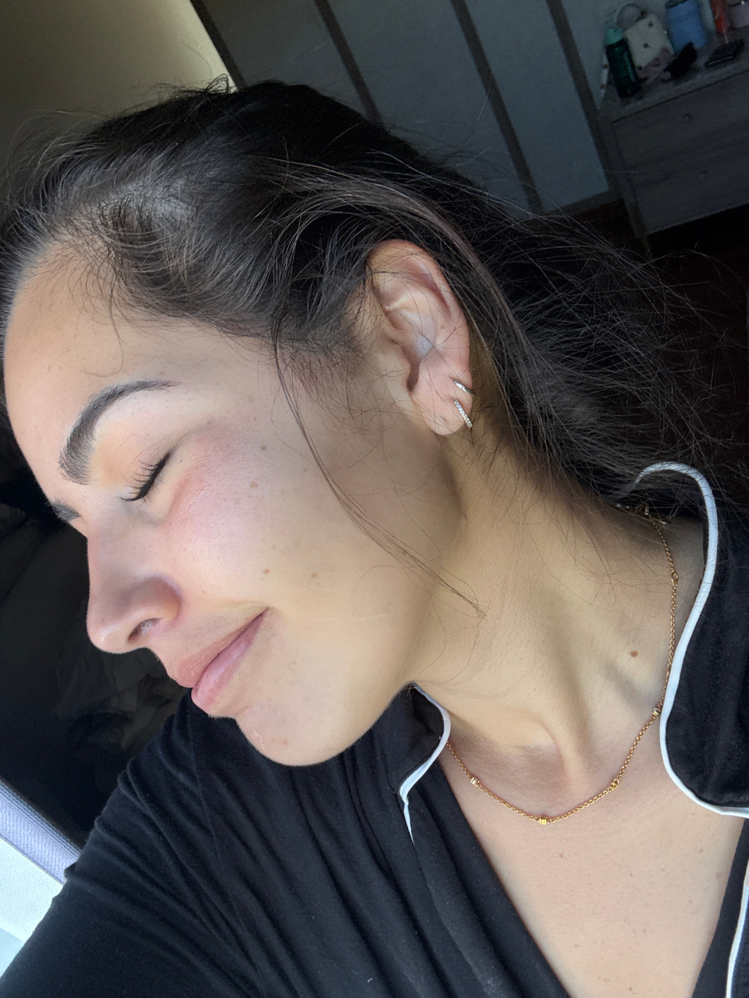 A woman is lying down, facing to the side. She has dark hair, fair skin, and a gold necklace. Her eyes are closed. She is wearing a black top with white trim. There are items on a shelf in the blurred…read more