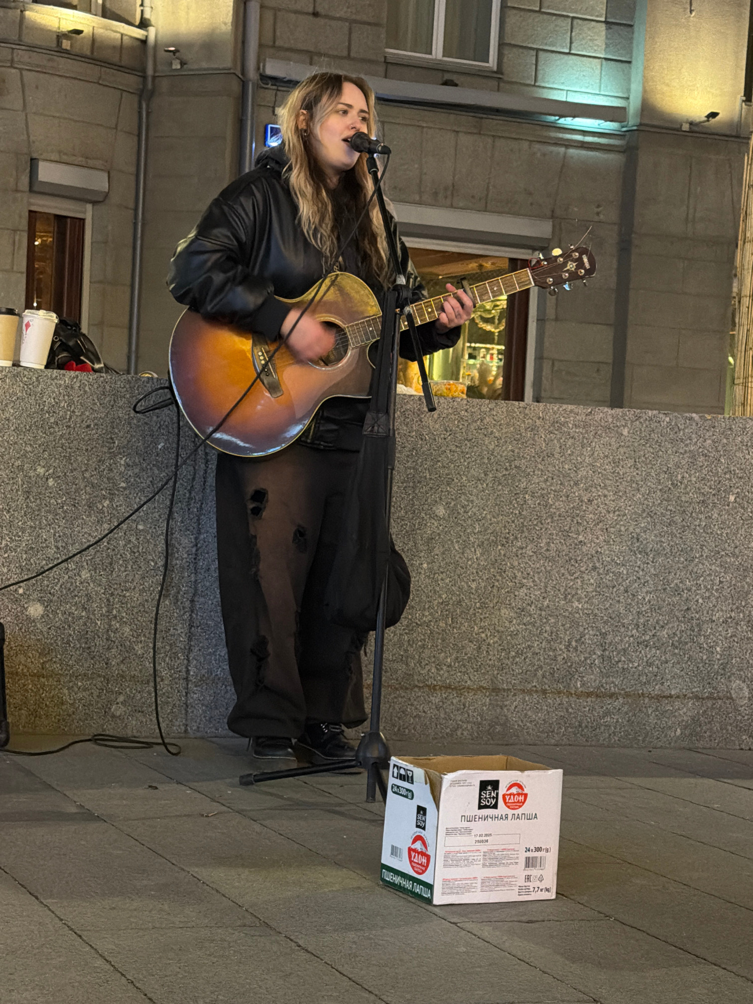 The image shows a woman performing as a street musician in what is likely the city of Moscow, Russia, based on the Cyrillic writing on a box next to her. She is playing an acoustic guitar and singing…read more