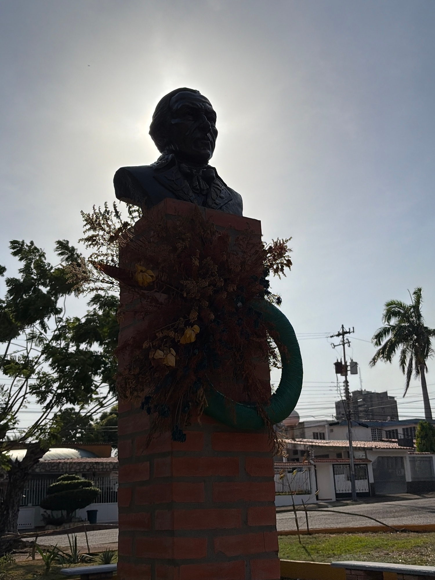The image shows a bronze bust of a man on a red brick pedestal, adorned with a dried floral arrangement and a green wreath. The bust is silhouetted against a bright sky. Behind the pedestal, there are…read more