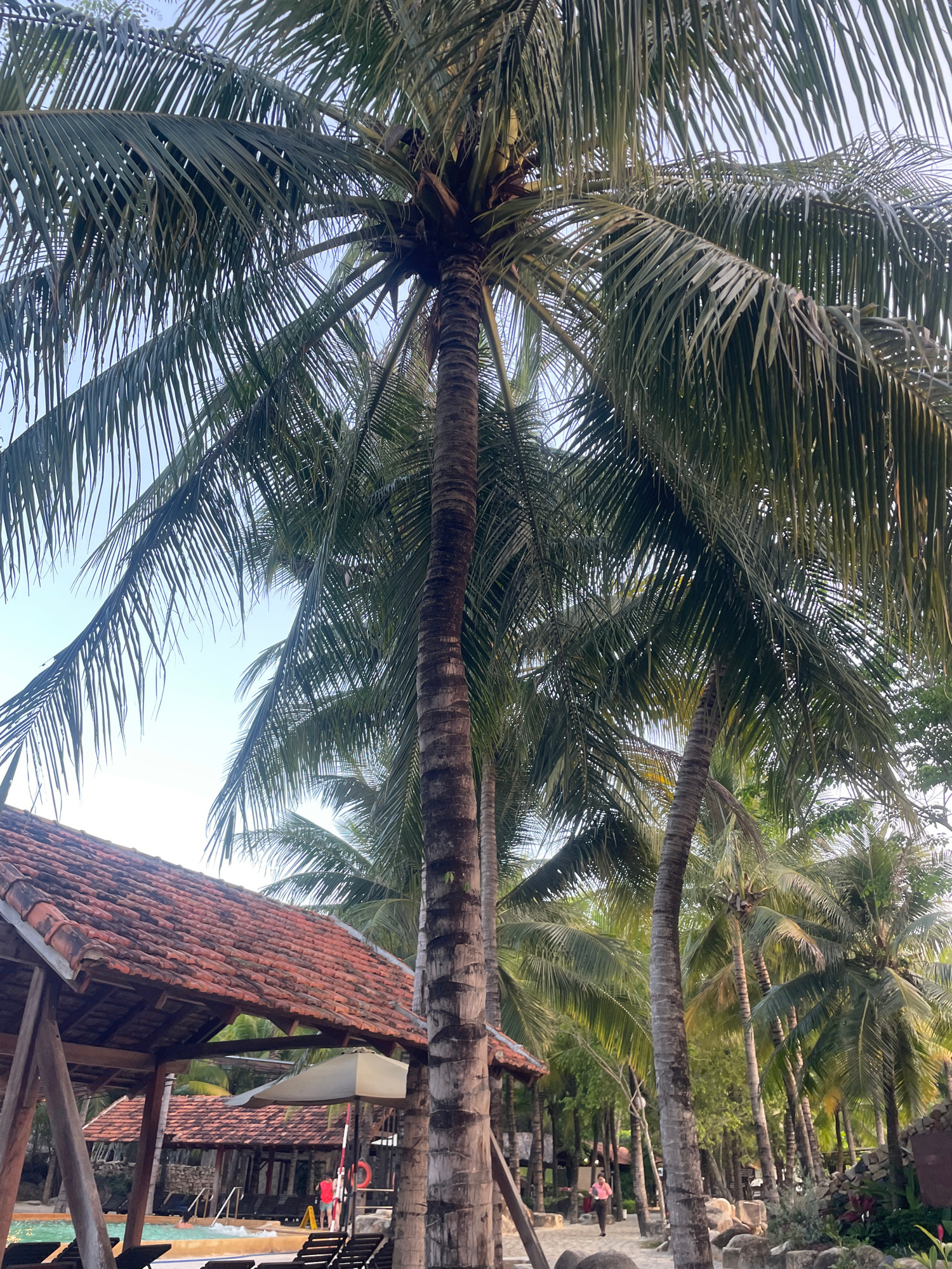 The image shows a view looking up at palm trees in Nha Trang, Vietnam. The trunks are tall and gray-brown, with green fronds densely filling the frame. A building with a red tile roof is visible in th…read more
