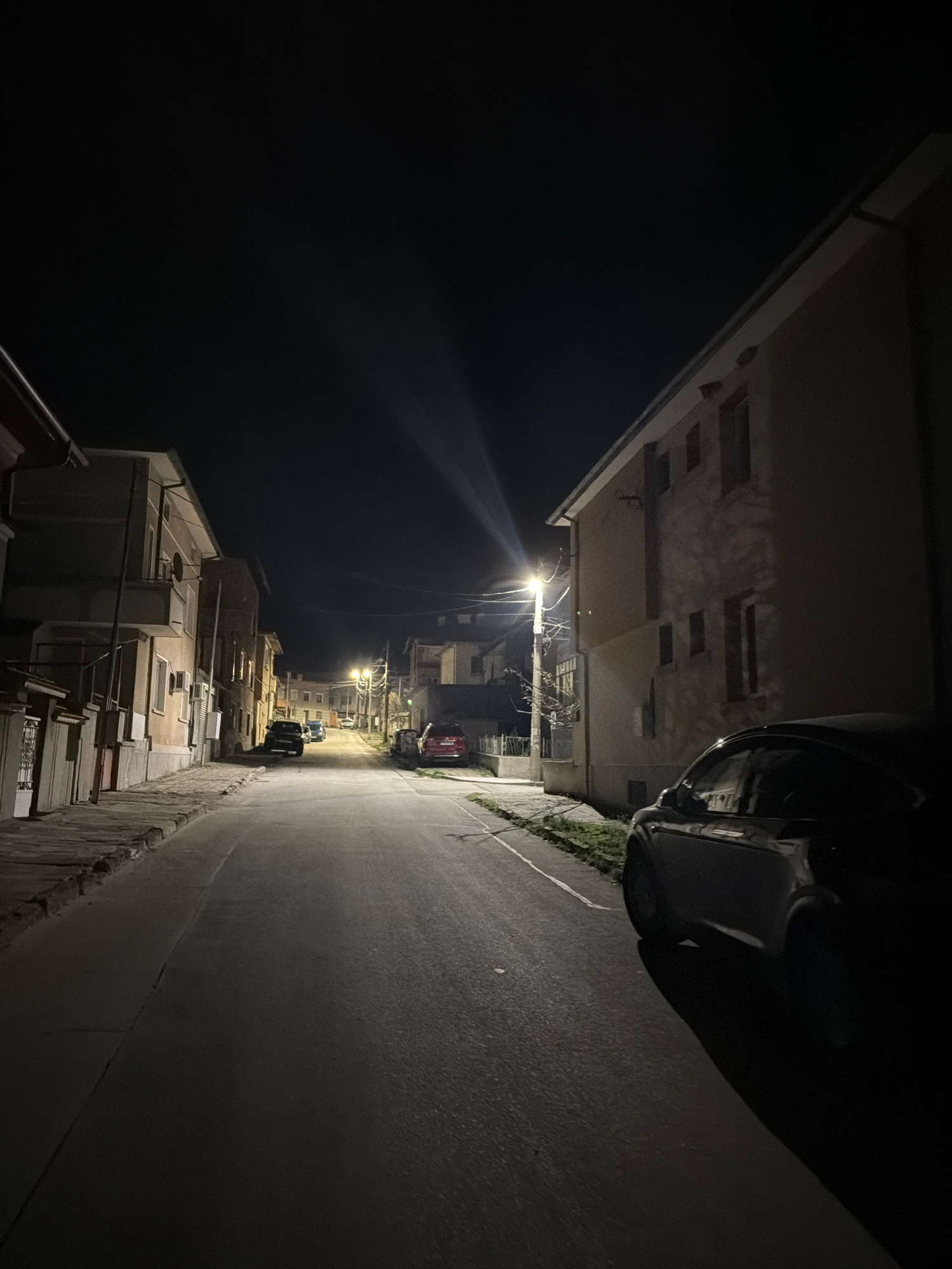 The image shows a narrow street at night in Panagyurishte, Bulgaria. The street is illuminated by streetlights, casting long shadows. Buildings line either side of the street, some with visible window…read more