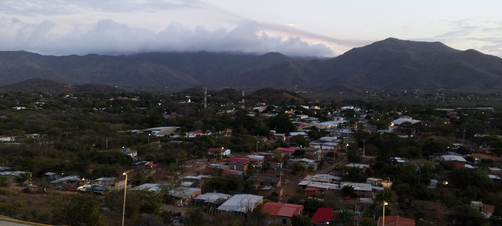 The image depicts an aerial view of Santa Ana, Venezuela, at dusk. Mountains are visible in the background, partially obscured by clouds. The foreground features a densely populated area with closelyโ€ฆread more
