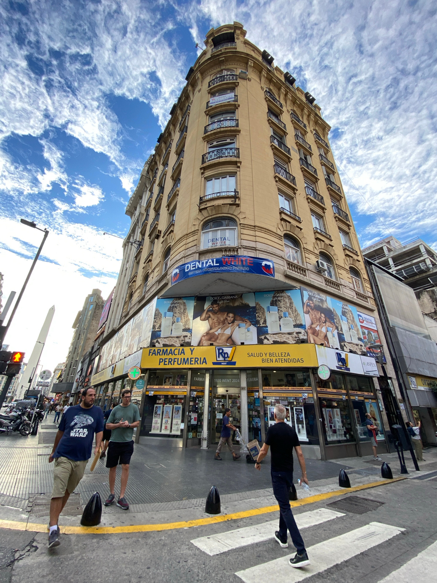 The image captures a street scene in Buenos Aires, Argentina, with a focus on a multistory building. The building, characterized by its light-colored facade and architectural details, features multiplβ¦read more
